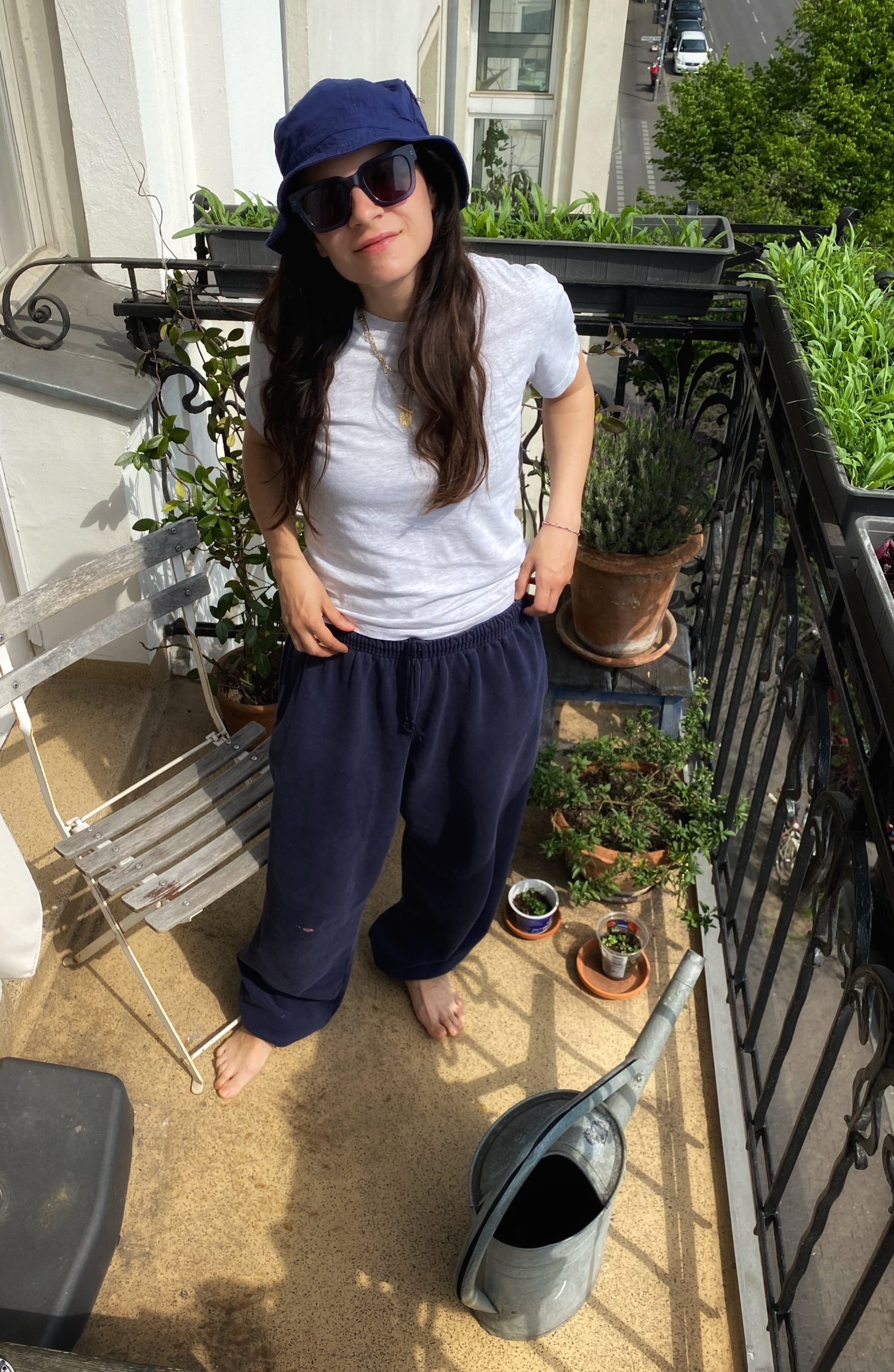 T-Shirt: Weekday, Fischerhut: Flohmarkt ähnlich hier, Jogginghose: Gildan, Sonnenbrille: Ace & Tate