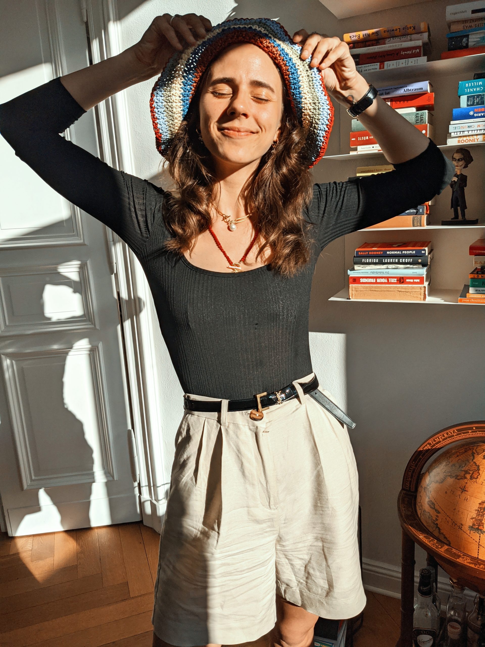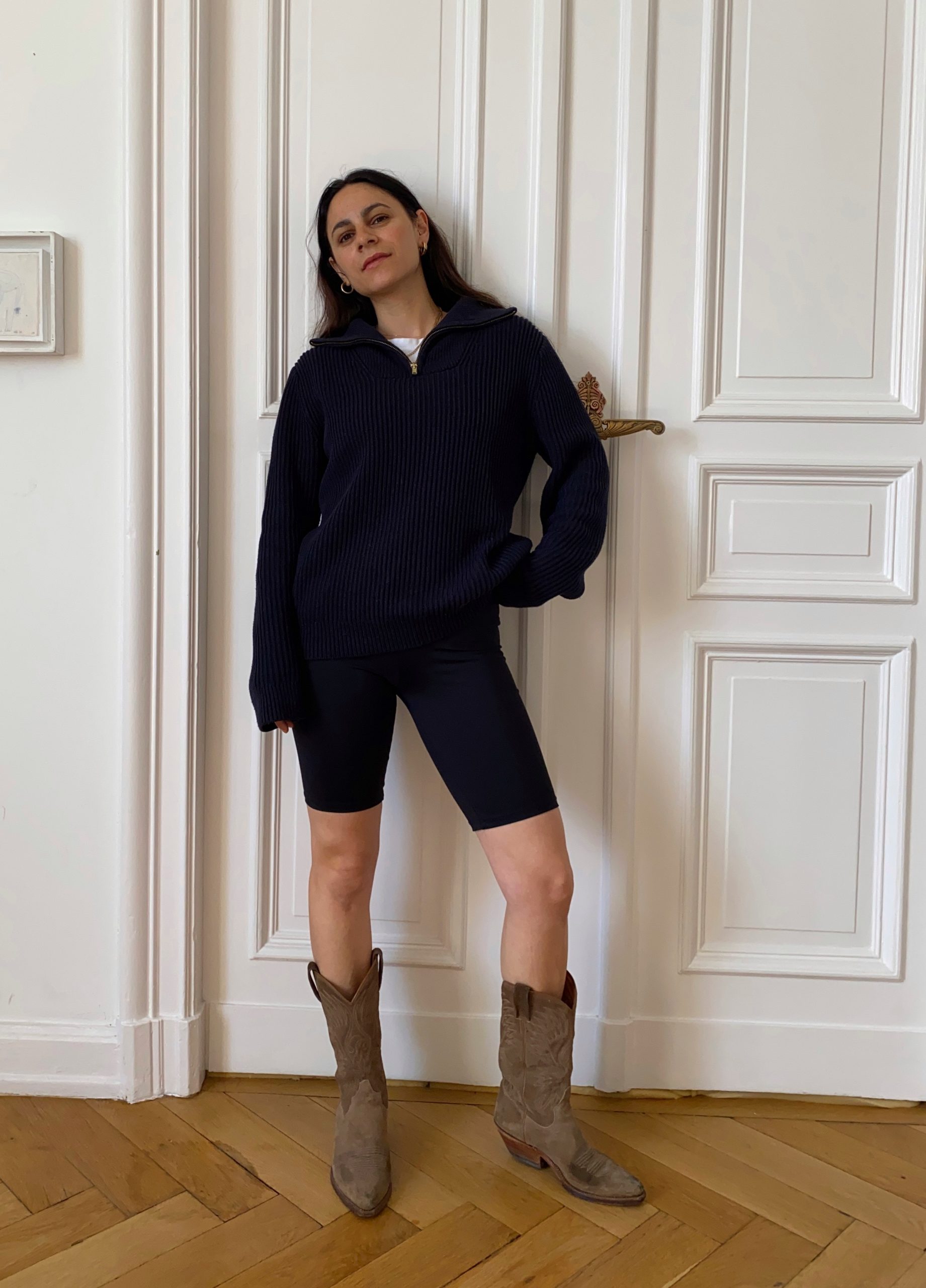 Strickpullover: H&M alt ähnlich hier, Radlerhose: &otherstories, Cowboystiefel: Vintage ähnliche hier, Creolen: Jukserei