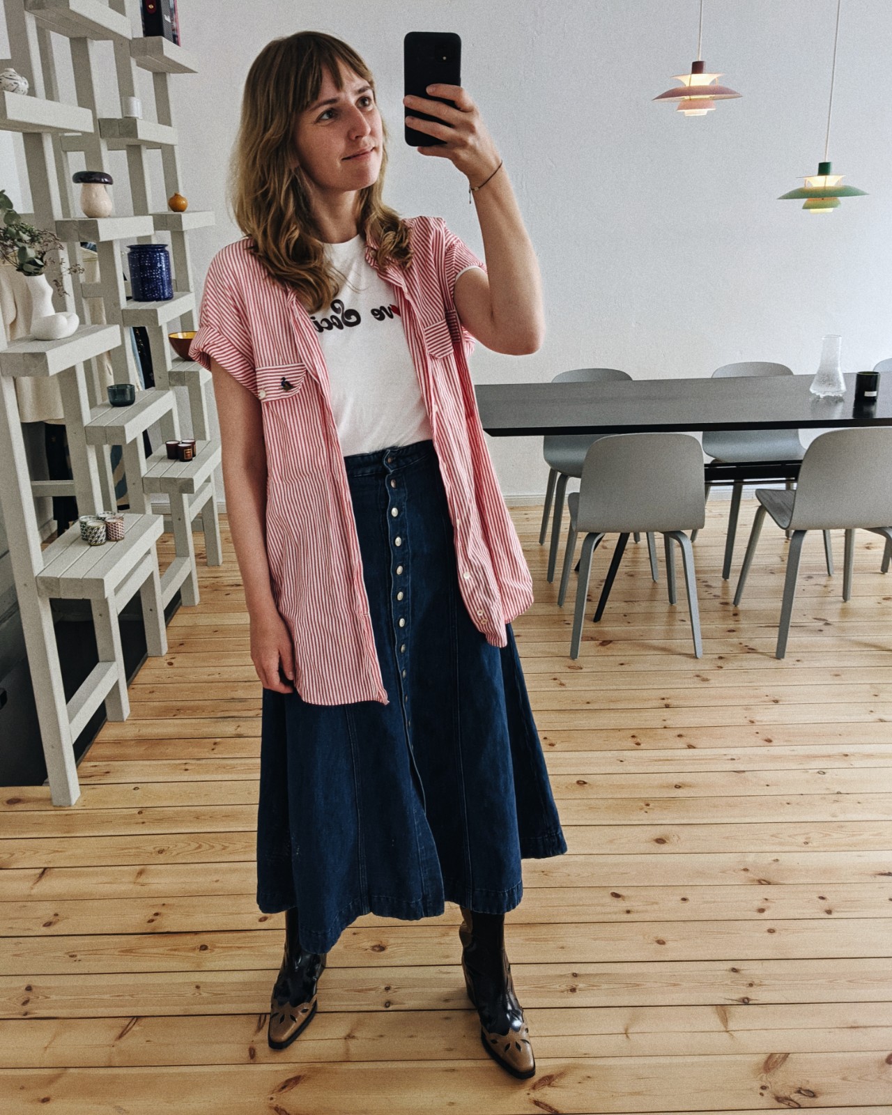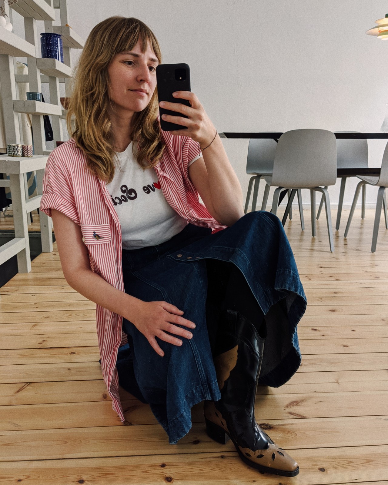 Hemd: Vom Papa, Shirt: Ganni x Anita Hass (alt), Rock: Acne Studios (alt), Cowboy Boots: Ganni