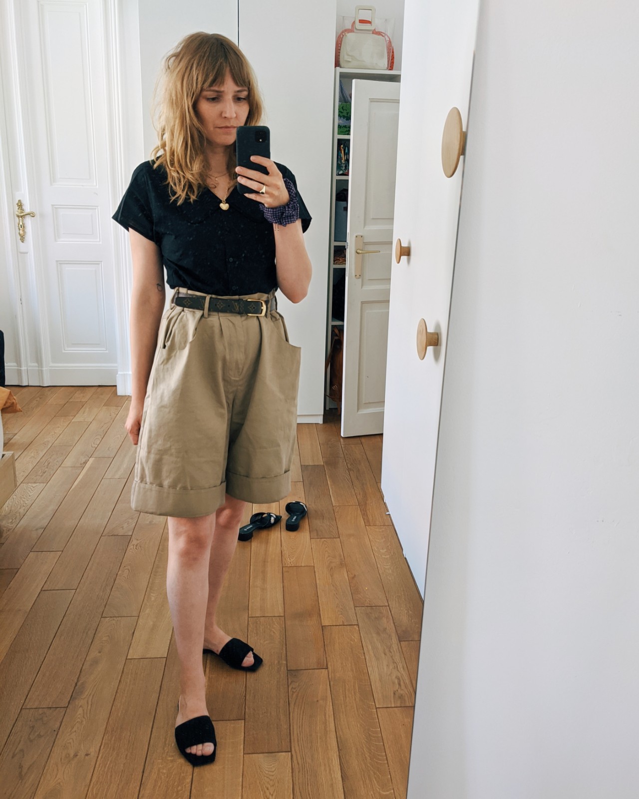 Shirt: MONKI, Hose: Acne Studios (alt), Gürtel: Louis Vuitton 2nd Hand, Schlappen: Aeyde, Kette: Closed x Maximova