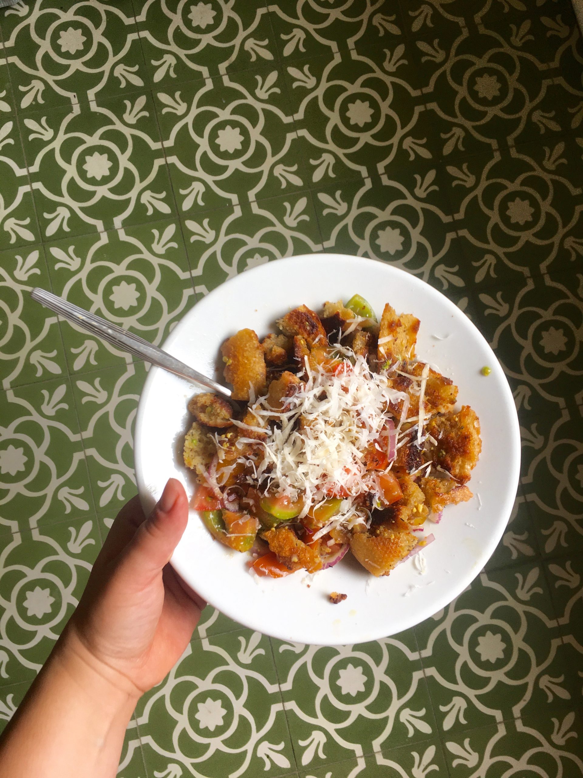 Zugegeben: Mein Brotsalat ist visuell alles andere als ansprechend, aber er schmeckt köstlich wie ein Sommerurlaub, ist noch dazu kinderleicht und fühlt sich, wer hätte es gedacht, so gar nicht nach Salat an. Passt super, wenn man nicht weiß, wohin man mit dem alten Baguette hin soll. Funktioniert natürlich auch mit Sauerteigbrot, Mehrkornbrötchen oder besserem Toast, wenn man nichts anderes zuhause hat.