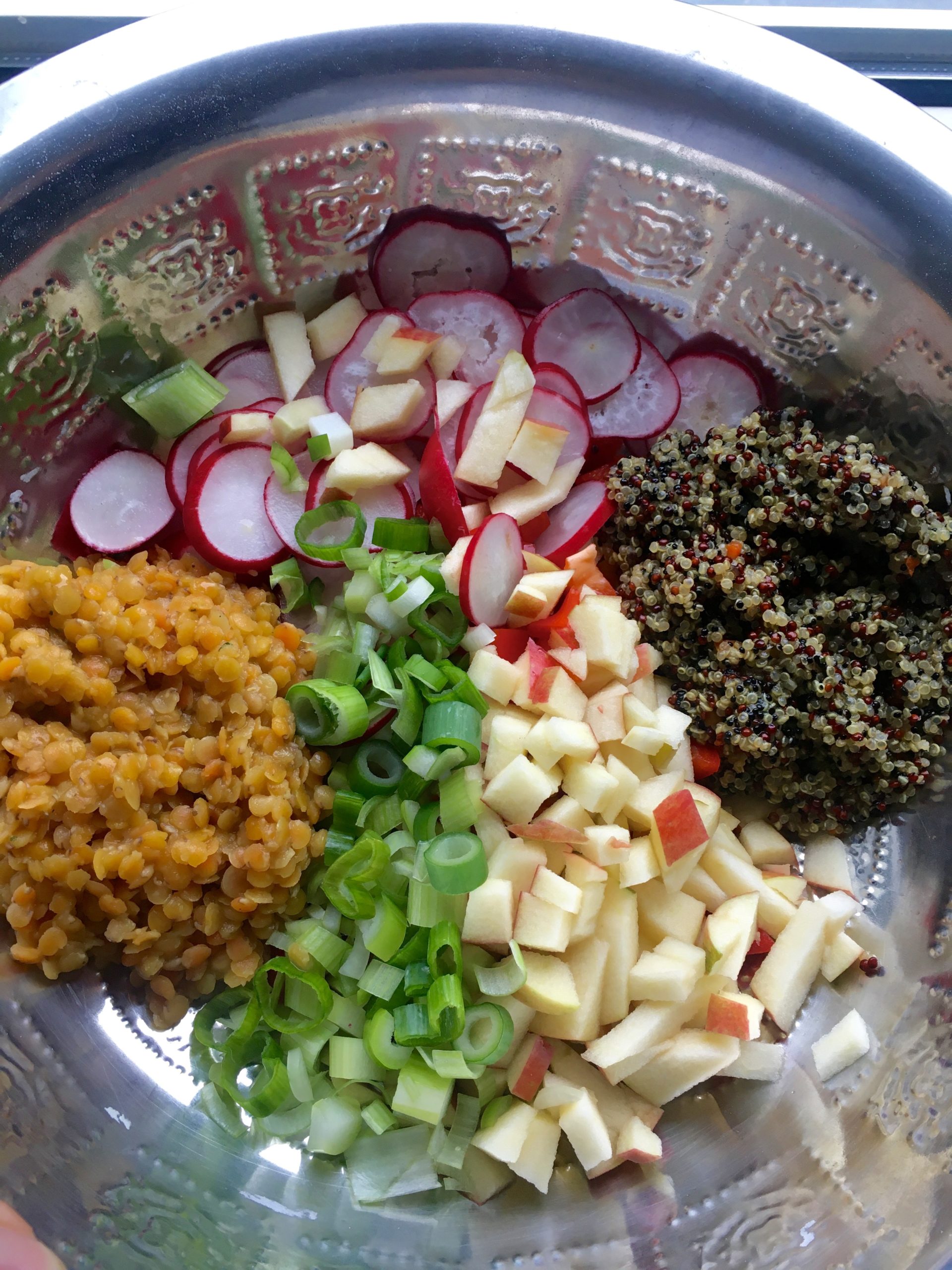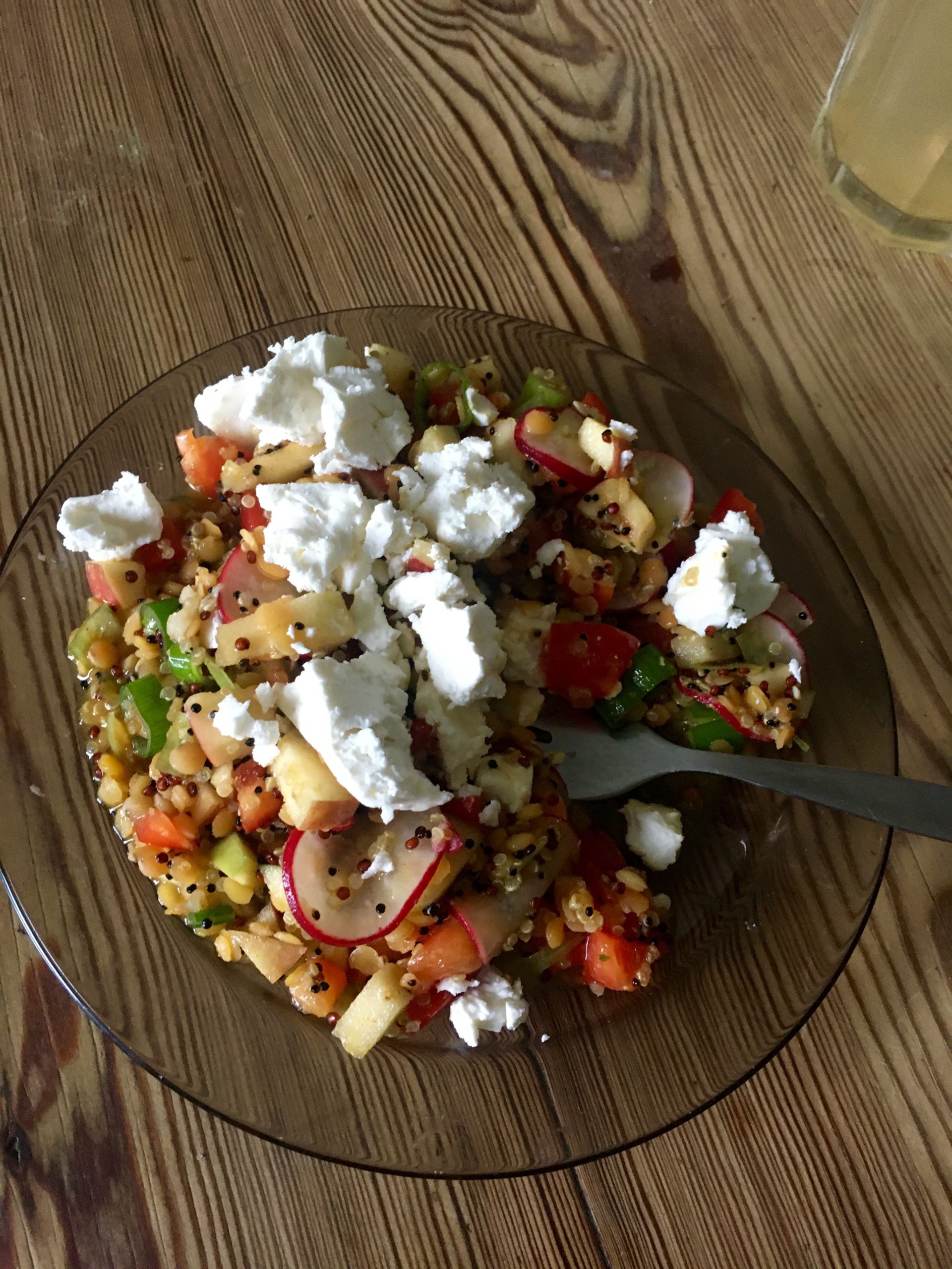 Mir ist es immer besonders wichtig, wie die Inhalte eines Salats geschnitten sind. Klingt albern, macht für mich am Ende aber den Unterschied. Radieschen in Scheiben und Paprika, Apfel, Frühlingszwiebel in gleich große Stücke schneiden. Gewaschenen Quinoa nach Packungsanweisung zubereiten und gewaschene Linsen in einem Topf mit etwas Öl, Cumin, Paprikagewürzt und Gemüsebrühe anbraten. Nach ein paar Minuten gebt ihr einen großen Schluck Wasser und lasst die Linsen unter regelmäßigem Rühren garen, bis sie weich, aber nicht matschig sind (ca. 10 Minuten). Wenn sich das Wasser verflüchtigt hat, gießt gerne einen Schluck nach. Lasst den Quinoa und die Linsen nun etwas abkühlen und vermengt sie am Ende mit allen anderen Zutaten. Orangensaft, Öl, Essig und Senf schließlich zu einem Dressing verrühren und mit Salz und Pfeffer abschmecken. Alles über den Salat geben und circa eine Viertelstunde ziehen lassen. Ich habe den Salat anschließend außerdem mit etwas Feta garniert.