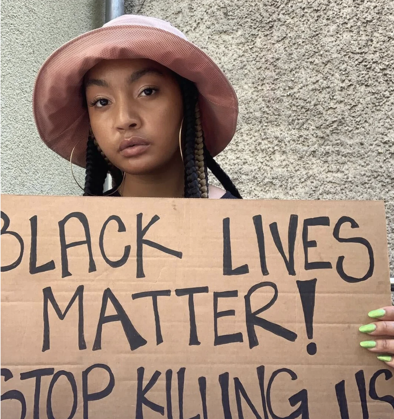 „Gestern im Speziellen war ein Tag, an dem ich sehr emotional war – am Tag vorher hatte ja einer unserer Proteste in Berlin stattgefunden, was generell psychisch nicht so einfach zu bewältigen ist. Und wenn man dann am nächsten Tag aufwacht und sieht, dass die Situation in den USA immer noch die gleiche oder sogar noch schlimmer geworden ist… Ich spüre einfach sehr viel Traurigkeit, anders lässt es sich nicht sagen. Ich bin deutsch und kenianisch, aber in den USA, genau genommen in Washington D.C., geboren und aufgewachsen. Was in den USA passiert, macht mich fertig – ich habe Familie und FreundInnen dort. Sie alle leben aktuell in Angst. Schon die Corona-Pandemie war und ist schwer genug für sie, und jetzt auch noch das. Meine Schwester hat zwei Söhne und ist mehr als besorgt, dass das, was wir gerade erleben, immer noch die Zukunft für ihre Familie sein wird.