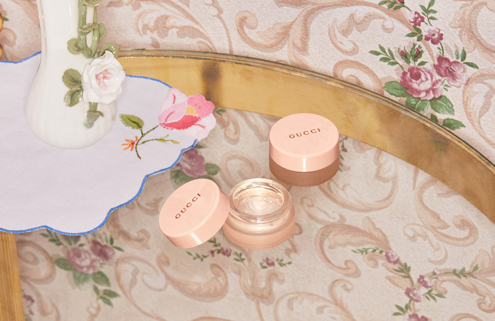 Dass ein italienisches Modehaus (Gucci) nun seine Beauty-Produkte mit französischen Namen versieht, ist nicht die Hauptneuigkeit, bringt mich aber dennoch zum Schmunzeln. Und irgendwie passt es auch zu dem Retro-Flair der Produkte, bestehend aus einem Augenbrauenstift in unterschiedlichen Tönen, einem Puder und meinem Favoriten, einem kleinen Döschen mit zäher transparenter Masse. Es handelt sich um eine Art Gel-Gloss, das vielseitig einsetzbar ist. Ich muss aufpassen, dass ich nicht mein komplettes Gesicht in den Tiegel drücke, schließlich reflektiert es das Licht auf der Haut so schön. Aber keine Sorge: Ich nehme es bloß als Highlighter, Lidschatten und Lipgloss. Nun gut, das wäre dann wohl schon mein halbes Gesicht.