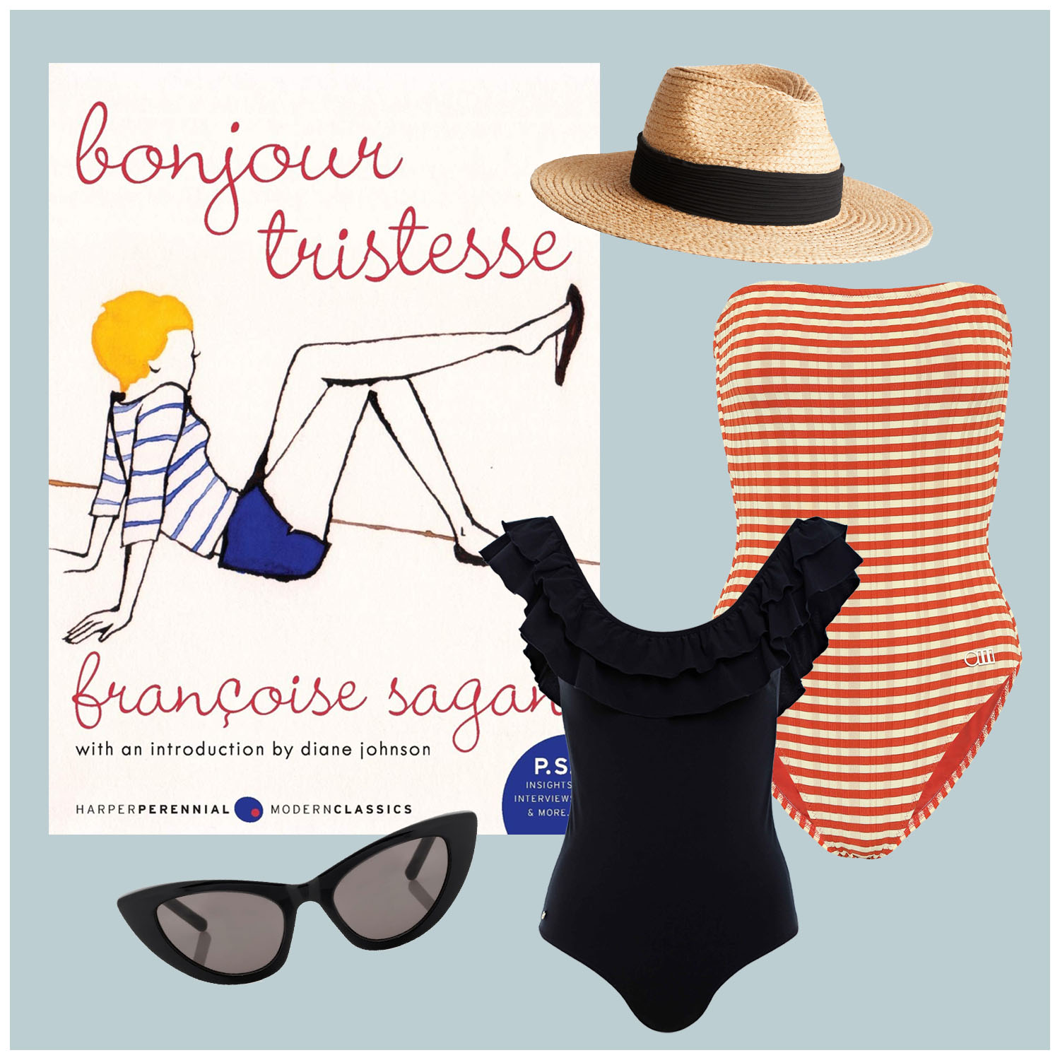 Rüschen, Muschelsaum und florale Muster — das Buch um Bonjour Tristesse, das von Cécile, die ihren Sommer gemeinsam mit ihrem Vater an der Côte d’Azur verbringt, ruft nach romantischen Badeanzügen und verspielten Bikinis, einem dramatischen Strohhut und einer Sonnenbrille in Cateye-Form.