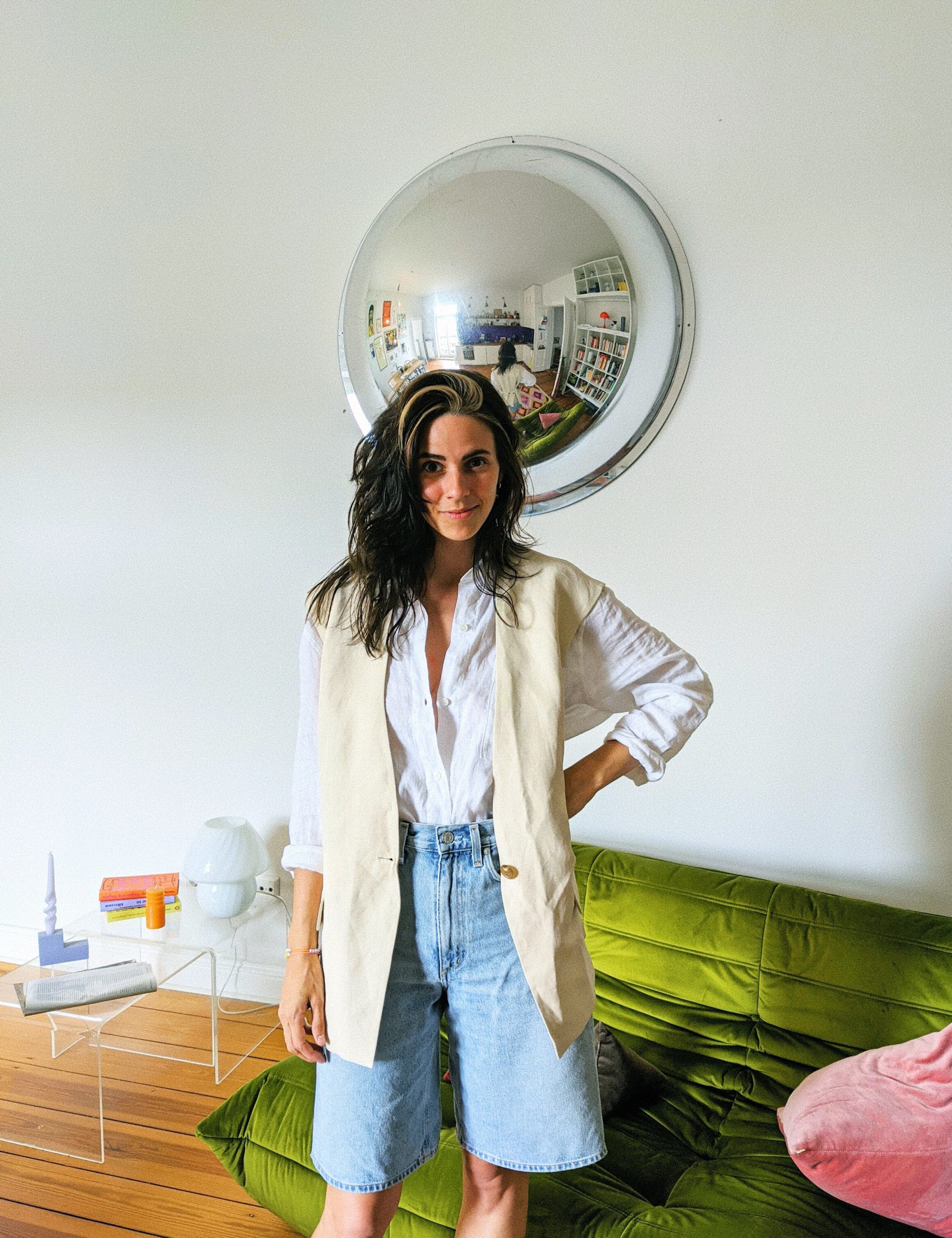 Bluse: Arket, Weste: Arket, Jeansshorts: A Golde