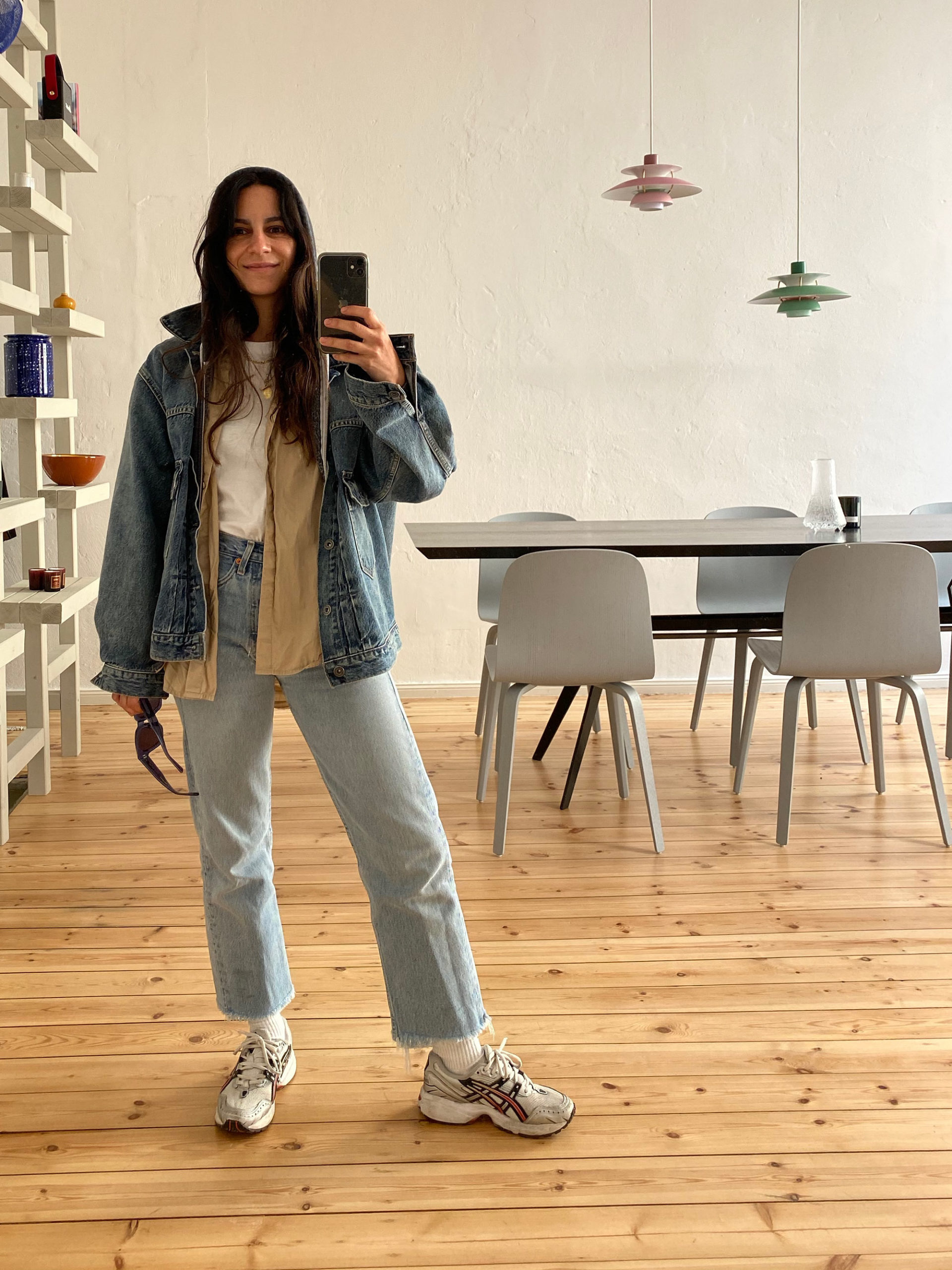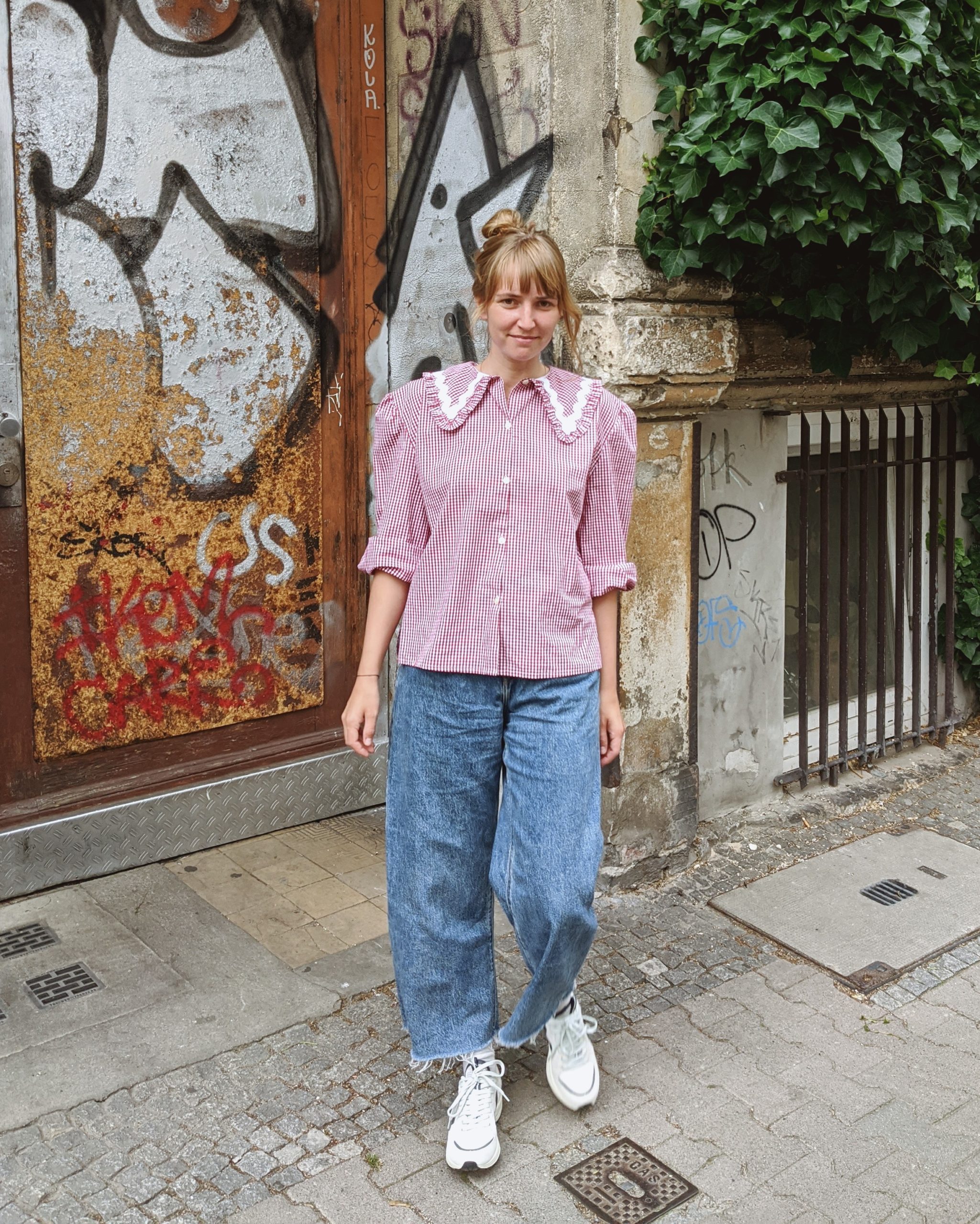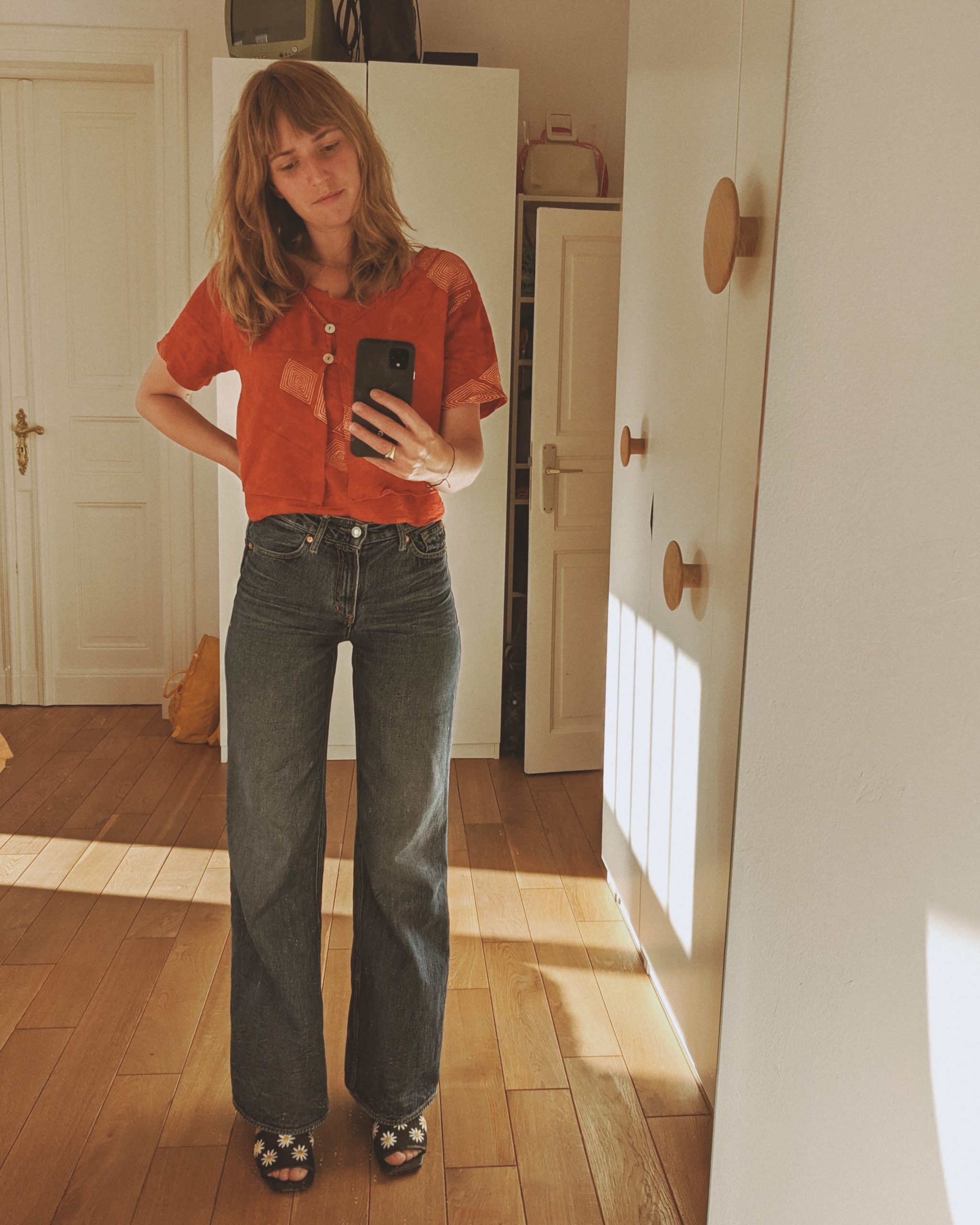 Bluse: La Veste, Hose: Levi’s Ribcage, Schuhe: Veja Venturi