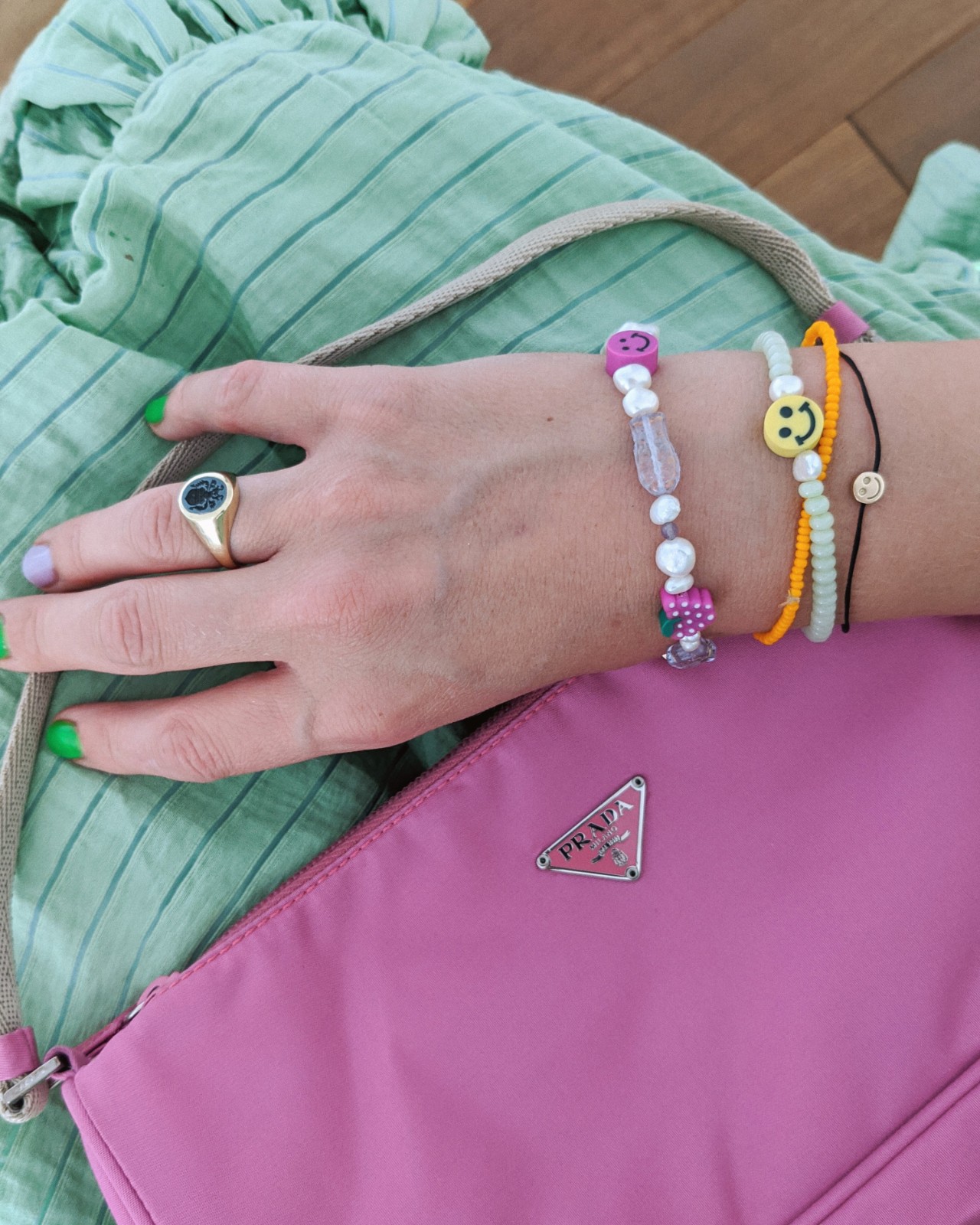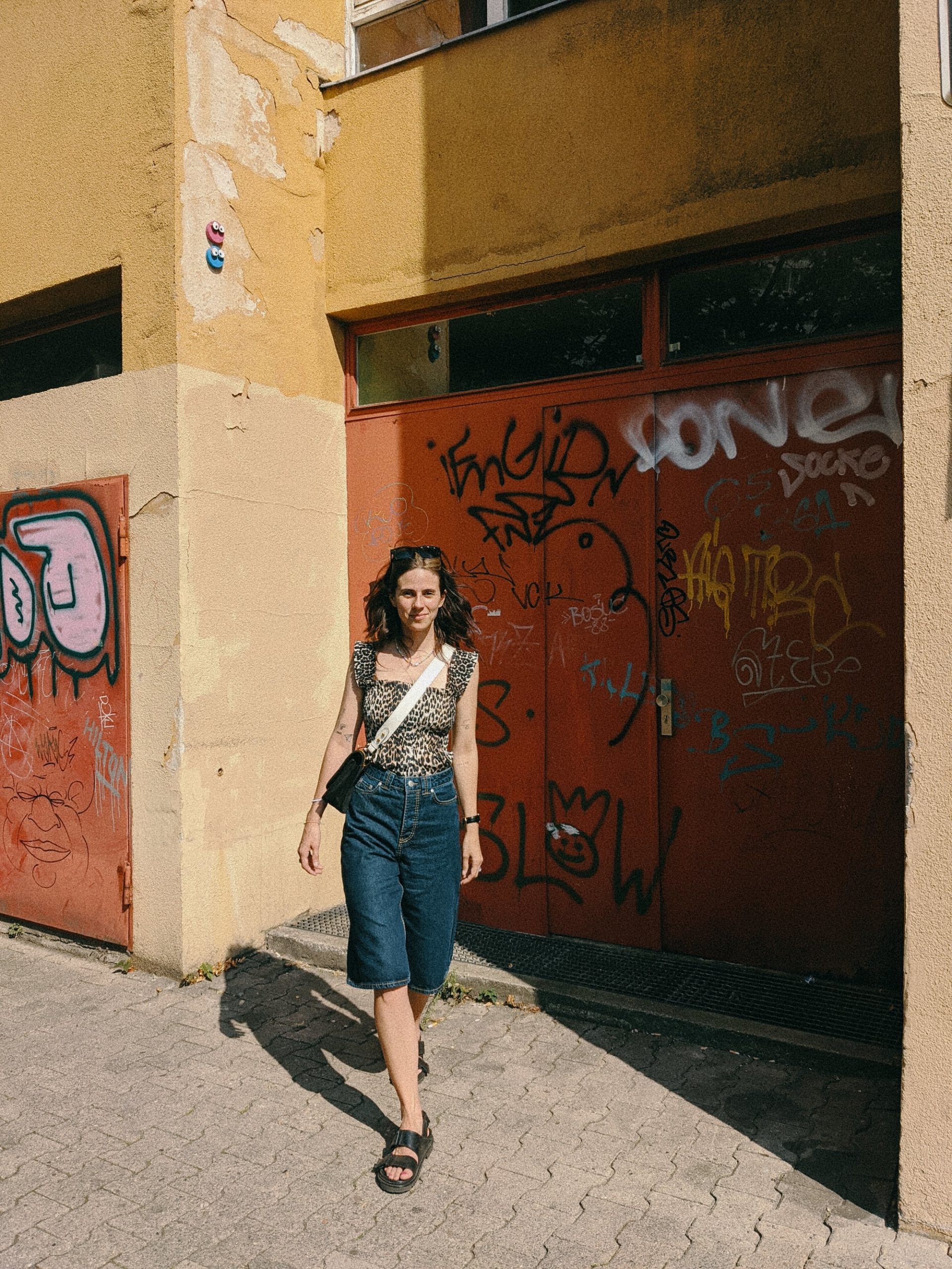 Sonnenbrille: Ace & Tate, Top: Ganni, Jeansshorts: Ganni (ähnliche hier), Tasche: Prada (älter, z.B. über Vestiaire Collective), Sandalen: COS