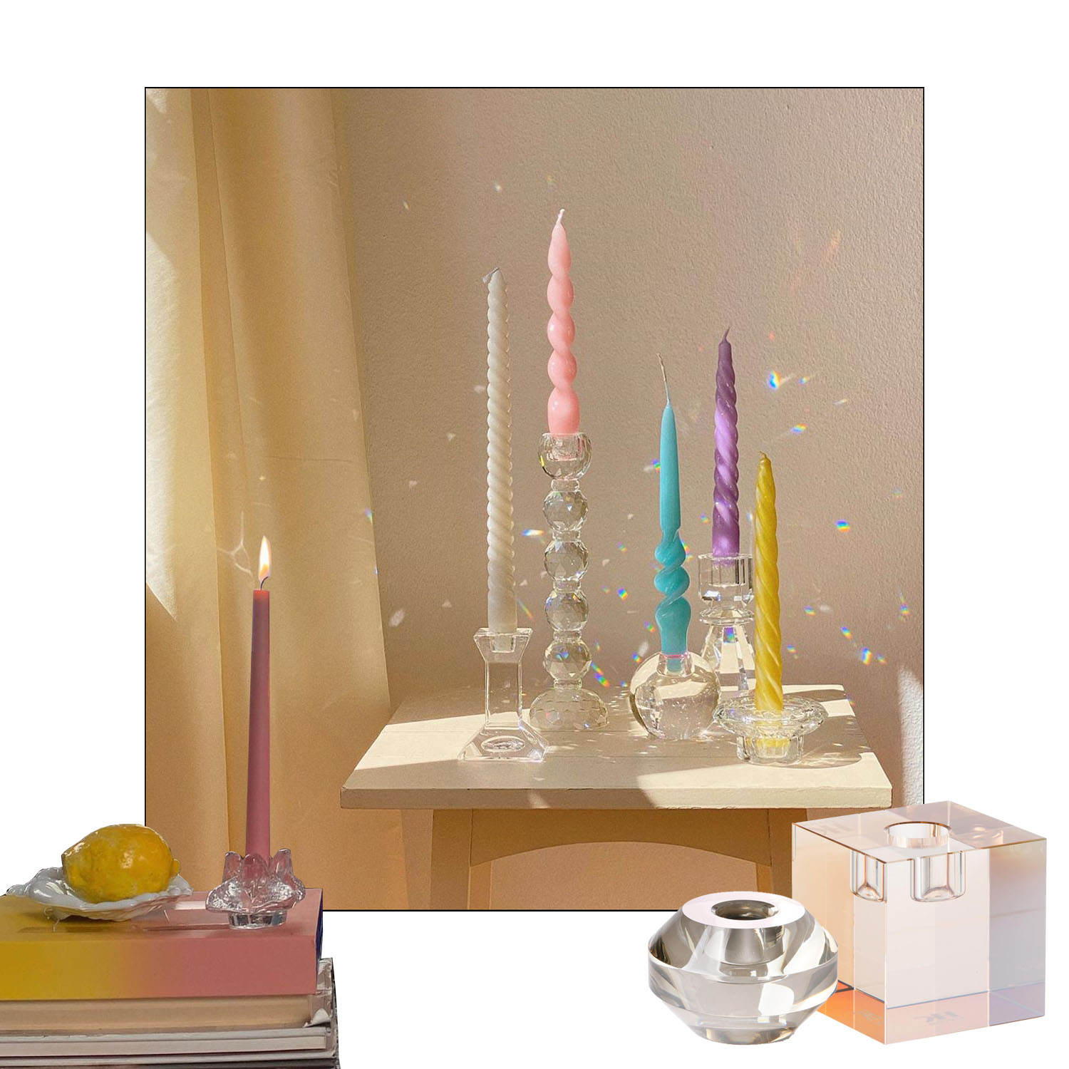 Neulich, da erzählte mir Nike von gläsernen Kerzenhaltern, die im Antlitz der Sonne kleine, regenbogenfarbige Muster auf die Wände werfen und leitete mir zugleich ein Best Practice Beispiel der wunderbaren Karoline Herr, die ja ohnehin stets die vielleicht beste Auswahl verträumter Interior-Schätze besitzt, weiter. Bis zu diesem Moment war mir die faszinierende, ja gar hypnotische Wirkung des Zusammenspiels aus Kristall-Kerzenständer und Sonnenlicht noch gar nicht so bewusst, doch spätestens jetzt liebäugle ich mit einem ganz eigenen Exemplar, das ich auf meiner leicht krummen Fensterbank platzieren kann, während im Hintergrund „The Garden“ von Papooz läuft. Das Schöne daran: Mit ein wenig Geduld findet man auf Secondhand-Plattformen (oder in der heimischen Vitrine) ganz grandiose Ausführungen, wobei sich mein heimlicher Favorit ehrlicherweise als ein, vielleicht weniger charmanter, bernsteinfarbener Klotz entpuppte. All meine Fundstücke habe ich euch weiter unten mitsamt einer Handvoll Inspirationen zusammengetragen.