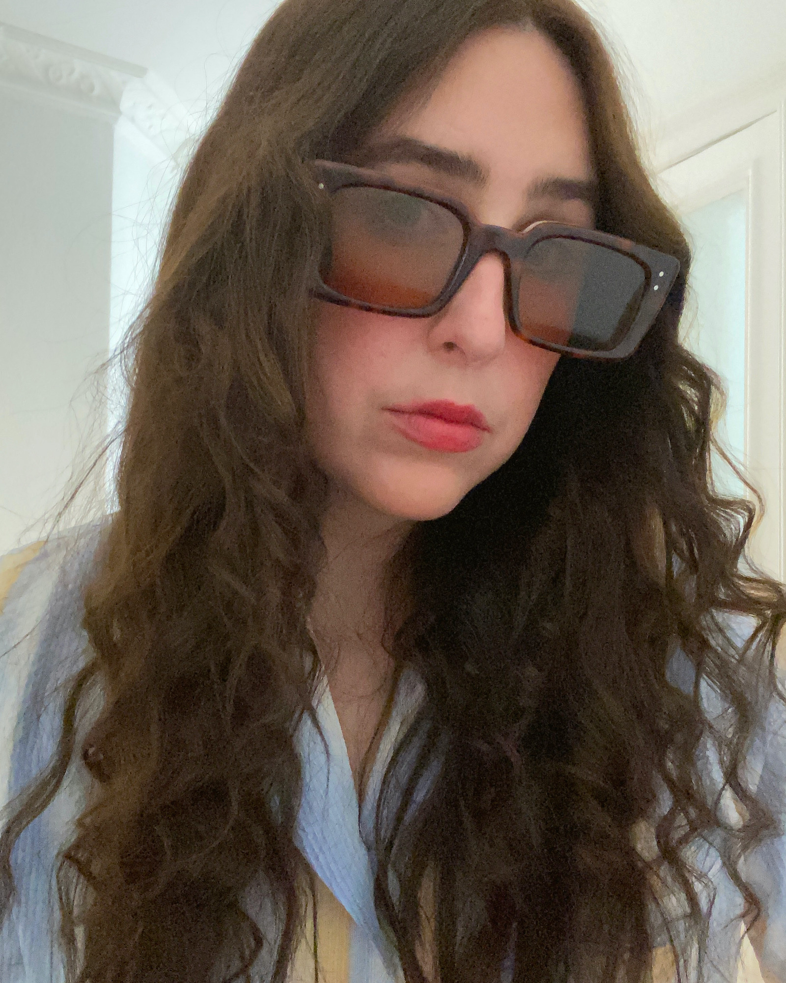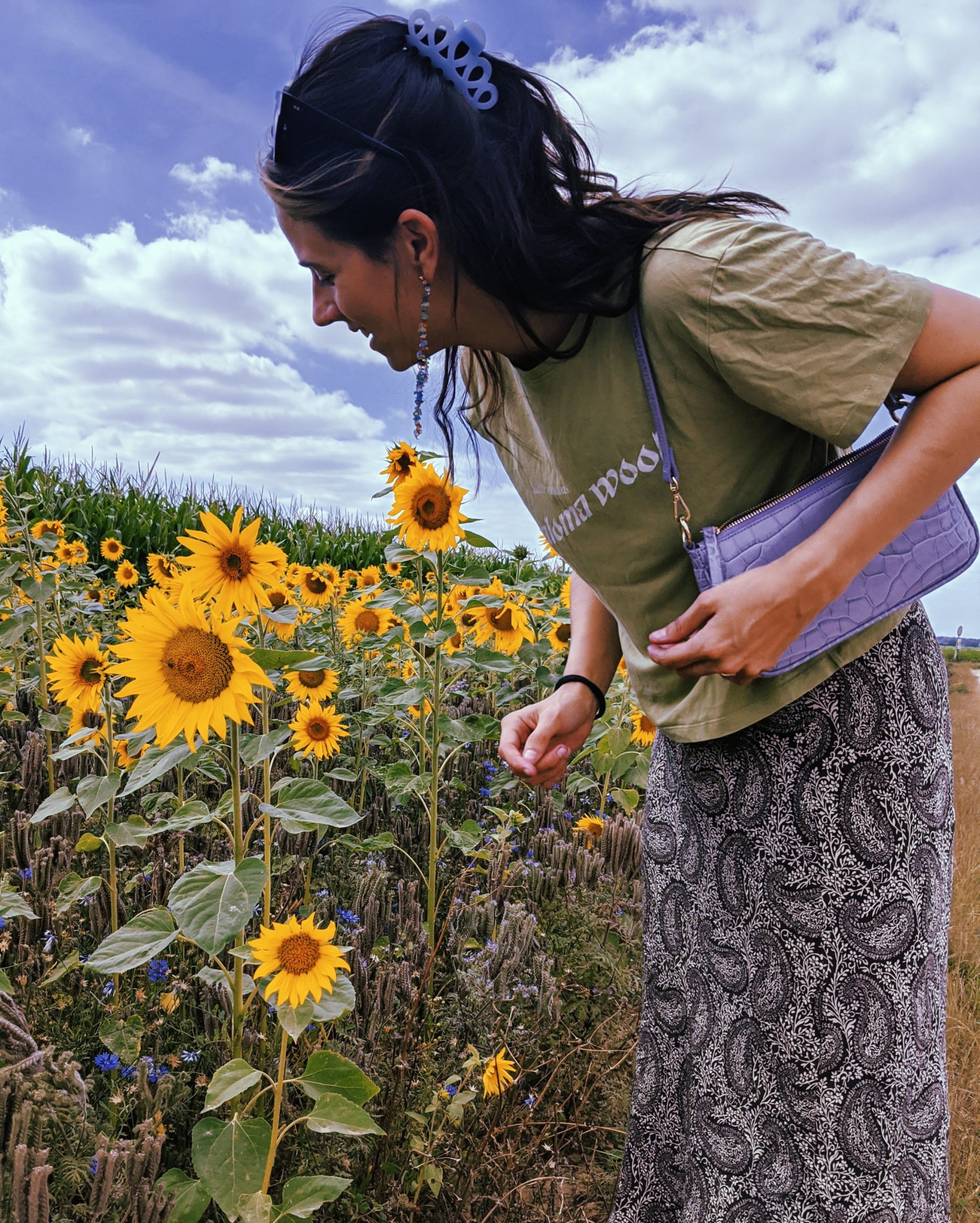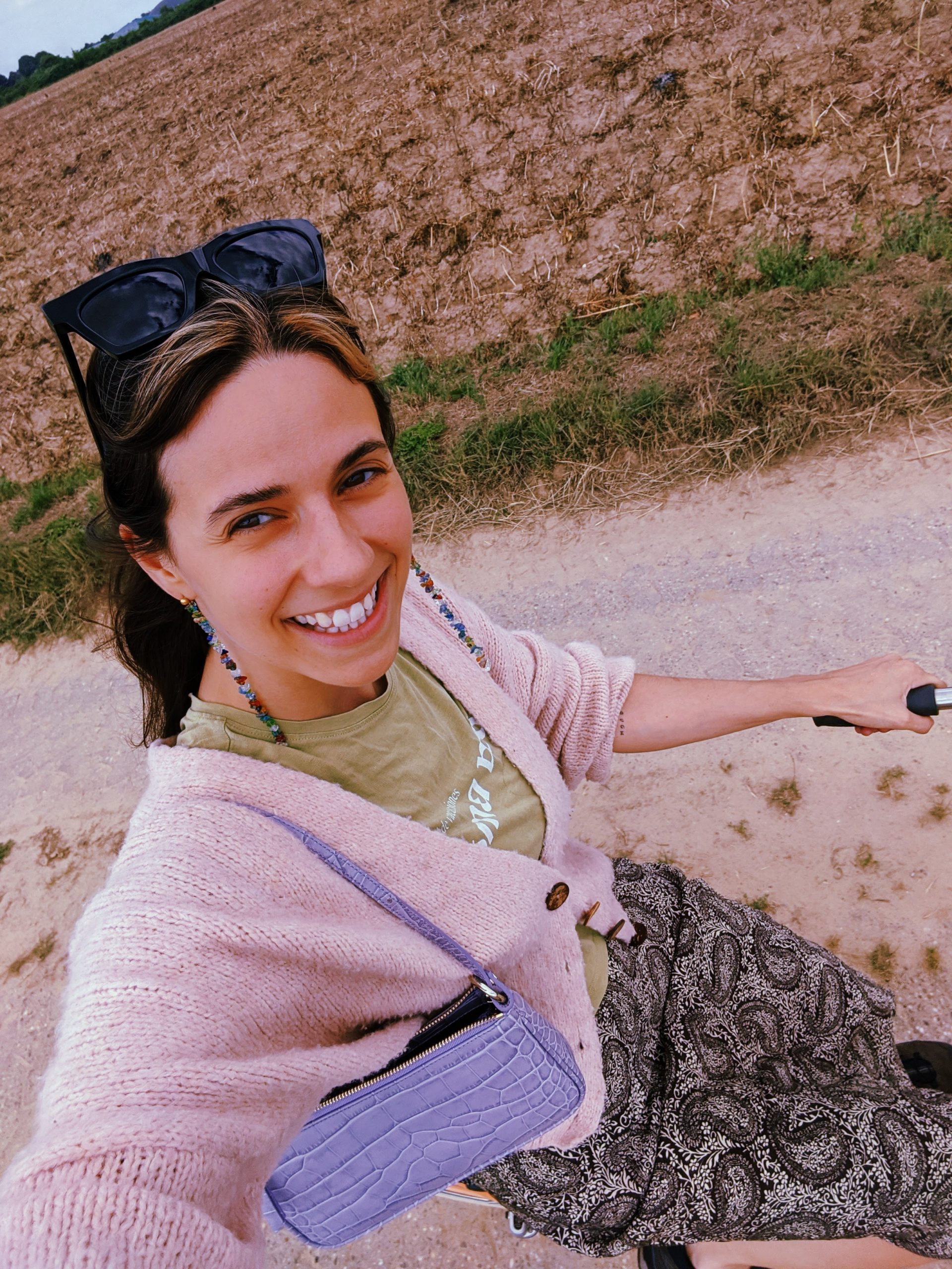 Sonnenbrille: Ace & Tate, Shirt: Paloma Wool, Rock: 2nd Hand, Tasche: & other stories