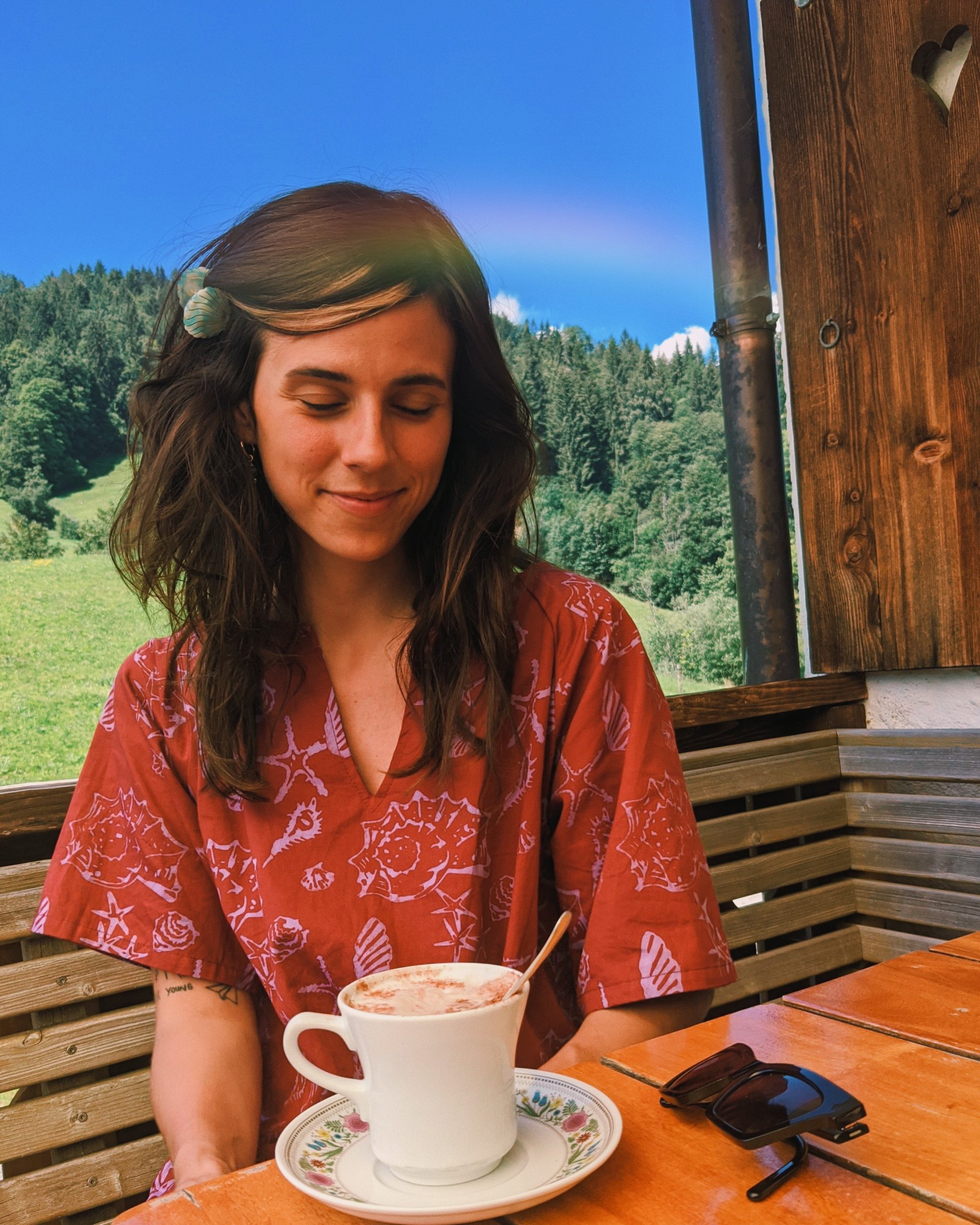 Vor der zwei wöchigen Auszeit, die wir mit unseren Familien und vor allem im Grünen verbrachten, war ich ganz schön verschrumpelt, innerlich, jedenfalls was das Hirn angeht. Weshalb ich auch nicht sehr viel mehr angestellt habe, als selbiges verschnaufen zu lassen, stundenlang zu wandern, Kühen beim Kauen zuzuschauen und Pizza zu backen, draußen im Garten. Gebatikt haben ich außerdem, zusammen mit meiner Mama und meinem Kind, das dabei unermüdlich Celine Dion Texte sang, weiß der Teufel(!), weshalb, Ohrwurm halt. Ich habe mit meinen Schwestern auf unserem Hof geplantscht als wären wir noch ganz klein, mit Oma Erdbeerkuchen verdrückt und meinem Papa zu erklären versucht, weshalb es absolut sinnvoll ist, kunstvolle Kerzen unter gar keinen Umständen abzufackeln. Ich habe geweint, weil Berlin mir selbst aus der Ferne so schwer vorkam und ich kurz von großen Veränderungen träumte (ihr wisst schon, das, was Berge immer mit einem machen) und noch hundert Mal mehr gelacht. Meistens über mich selbst, bis mir der Bauch weh tat. Aber auch, weil ich schrecklich aufgeregt und neugierig auf dieses Leben bin. Zwei Tage nach meiner Rückkehr hat sich das Hirn übrigens noch immer nicht entfaltet. Immerhin arbeite ich dran. Neuerdings wieder mit Meditation. Ist bestimmt das Batik-Kleid dran Schuld.