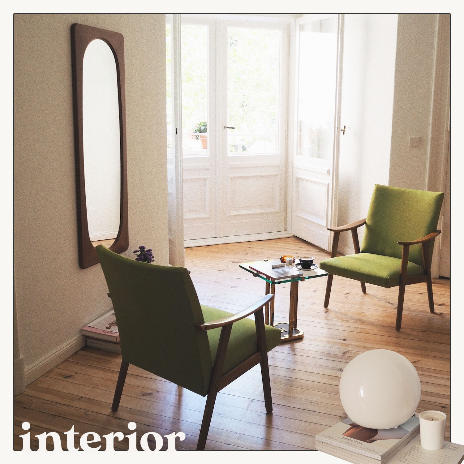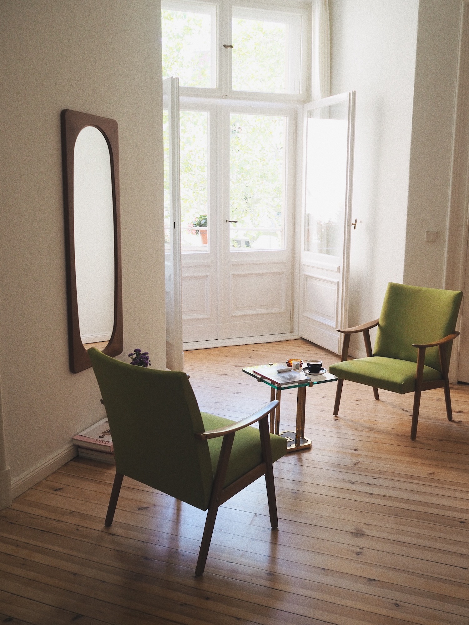 Meine vielleicht liebste Ecke der ganzen Wohnung ist die Sitzecke im Balkonzimmer, der es zwar noch an einer Stehlampe und ggf. einem Teppich fehlt, aber dennoch der Ort ist, an dem ich meinen morgendlichen Kaffee am liebsten trinke. Die beiden Easy Chairs mit hellgrünem Bezug fand ich einst in einem Shop über Ebay Kleinanzeigen, den wundervollen Glastisch kauften wir vor etwa zwei Monaten einem wahnsinnig netten Ehepaar ab. Vor dem Spiegel, der ein wenig zu tief hängt (mein Verschulden), habe ich einen Teil meiner Magazinsammlung gelagert — auch, wenn manche Menschen Bücher- und Magazintürme auf dem Boden schrecklich finden, habe ich eine Vorliebe für sie. Den hübschen, bernsteinfarbenen Aschenbecher fand ich übrigens vor etwa einem Jahr auf Etsy und obwohl in diesem Haushalt niemand raucht, bestellte ich ihn noch im gleichen Moment. Seither wanderte er von Tisch zu Tisch und hat nun endlich seinen festen Platz gefunden.