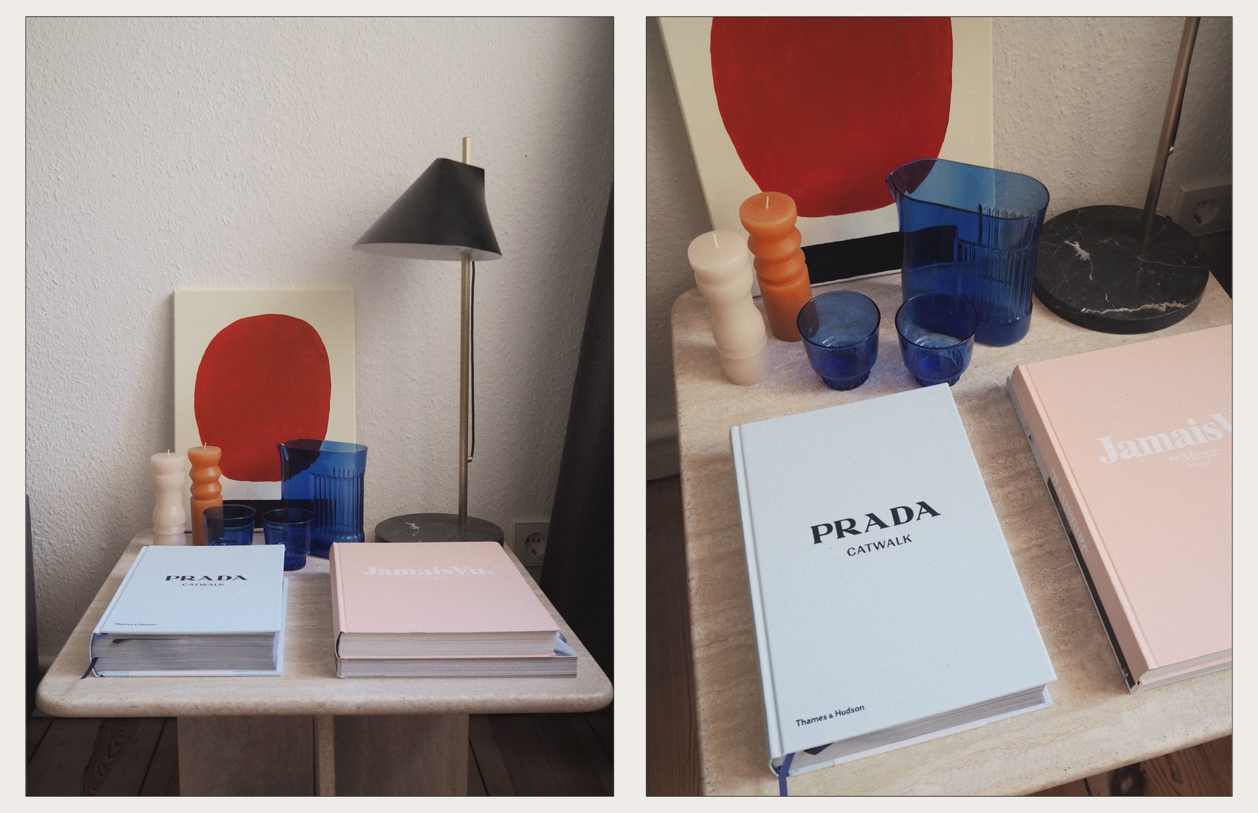 Travertin Tisch: Ebay Kleinanzeigen, Kerzen, Gläser und Karaffe: Area Ware, Lampe: Louis Poulsen, Bücher: Prada Catwalk, JamaisVu