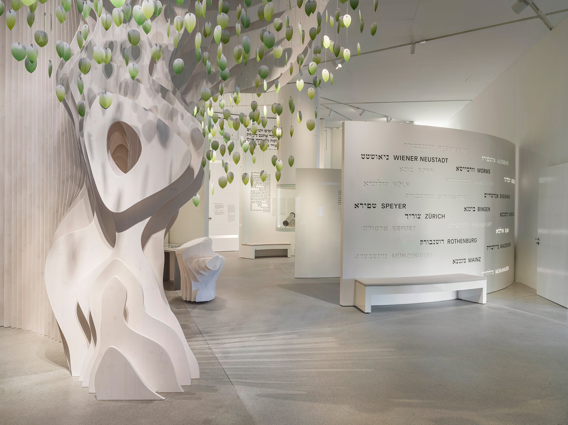 Als Willkommenspunkt wird künftig ein stilisierter, fünf Meter hoher Baum aus weiß gewachstem Holz die Besucher der neuen Dauerausstellung begrüßen. Jüdisches Museum Berlin, Foto: Yves Sucksdorff