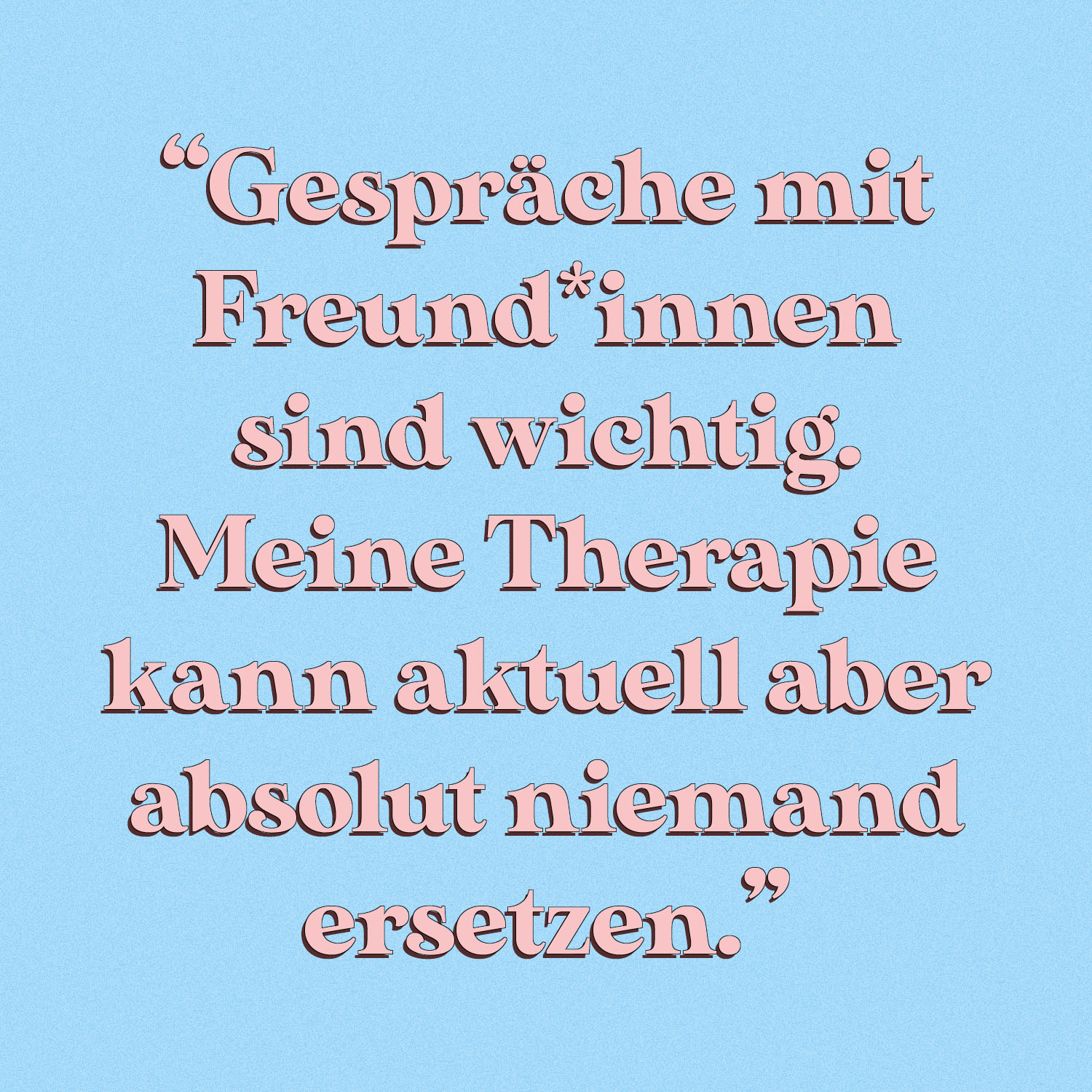 „Alleine zur Therapie zu gehen, hat mir die gedankliche Welt eröffnet, Hilfe annehmen zu können und Raum mit meinen Gefühlen und Gedanken einzunehmen. Lange Zeit habe ich mich mit meinen Gefühlen sehr bedeckt gehalten, bin davon ausgegangen, dass sie andere Menschen eher belasten und zermürben. Ich gebe mir heute sehr viel Mühe, Support einzufordern. Ich finde es wichtig, dass Menschen innerhalb von Freund*innen- oder Familienkreisen dafür sensibel sind und psychische Instabilität ernst- und wahrnehmen.“