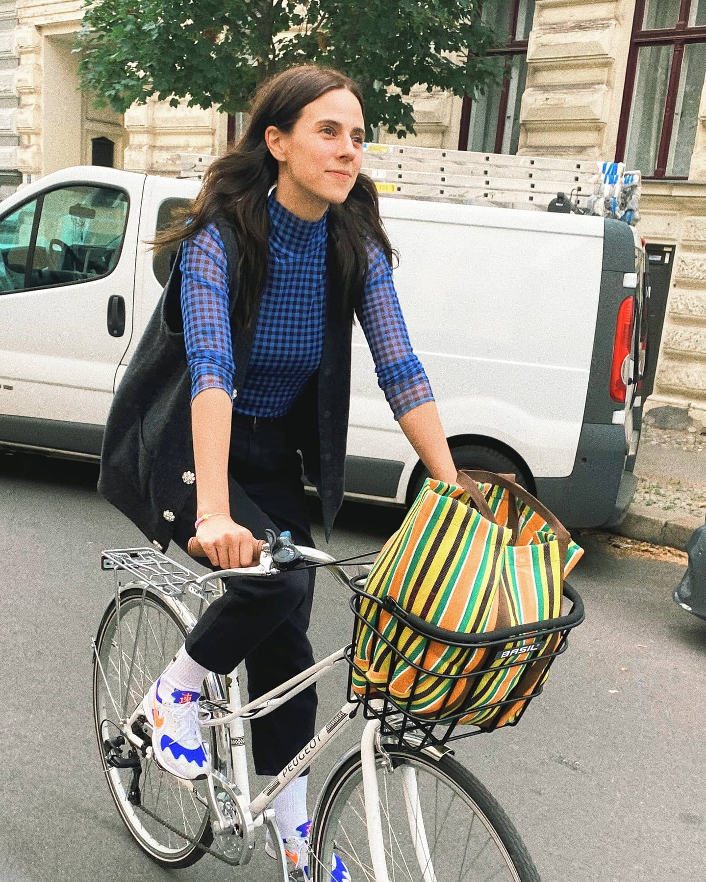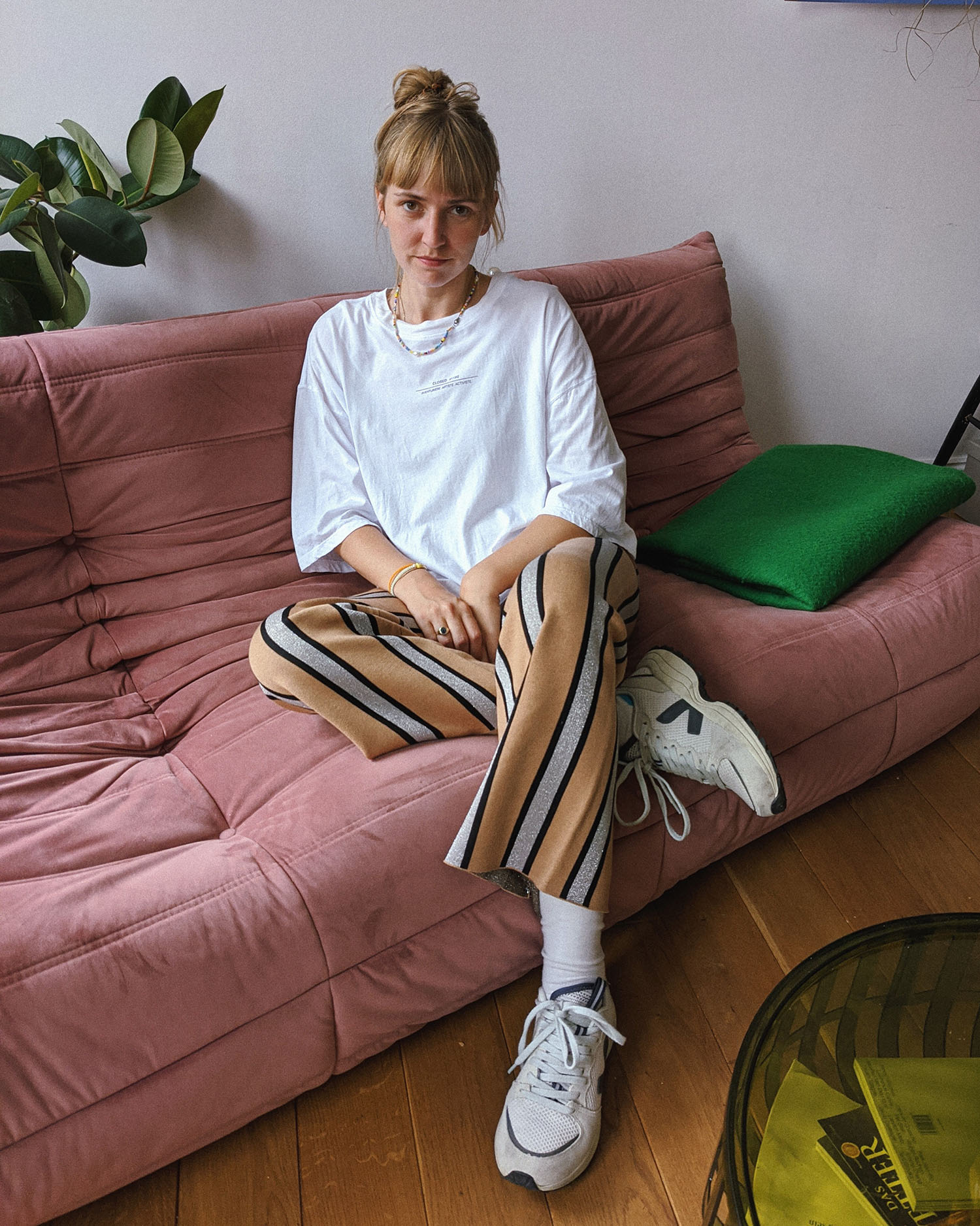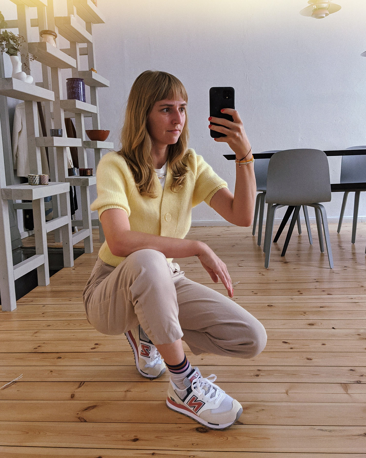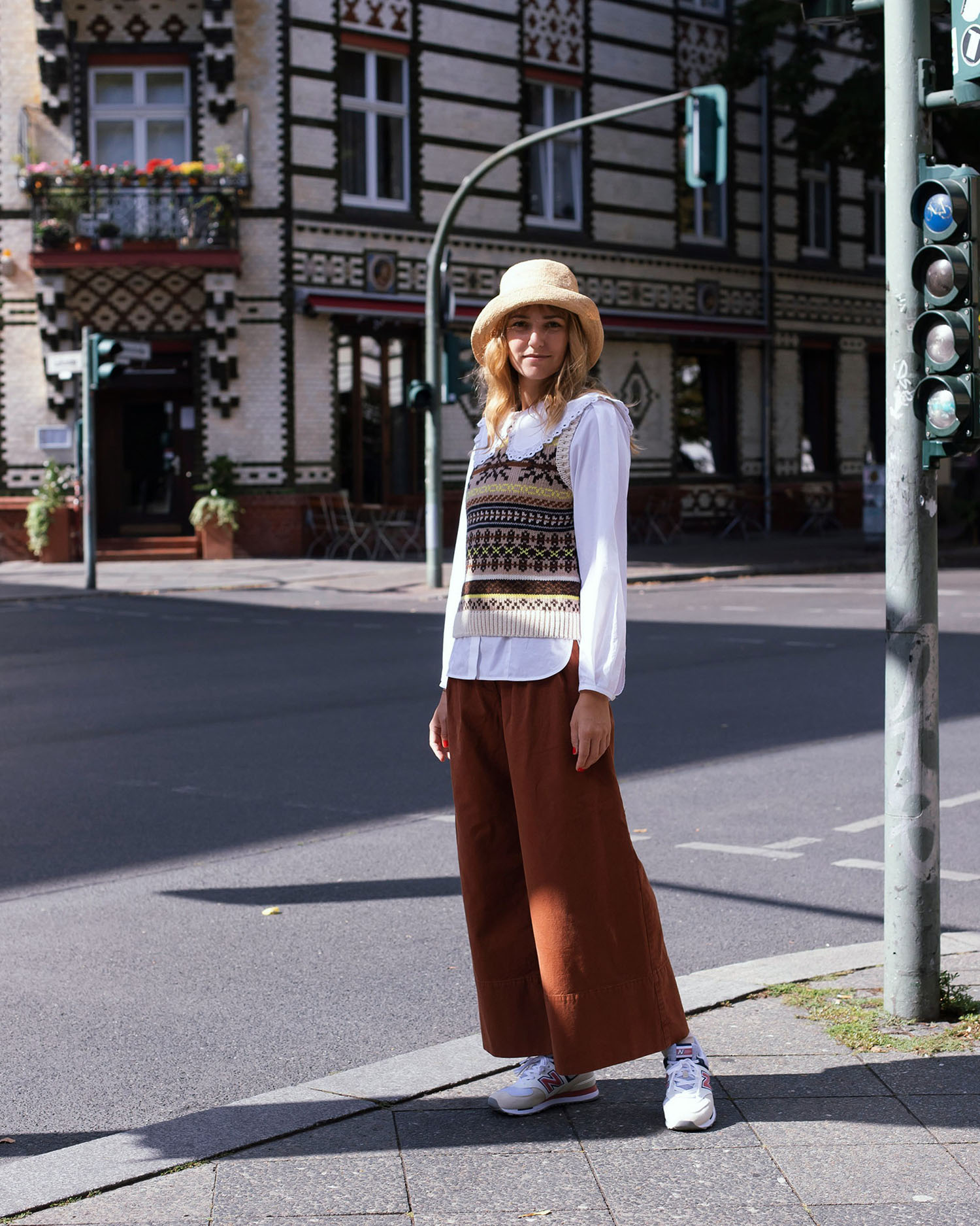 Bluse: Arket, Pullunder & Hose (coming soon): Baum & Pferdgarten, Hut: & Other Stories, Schuhe: New Balance