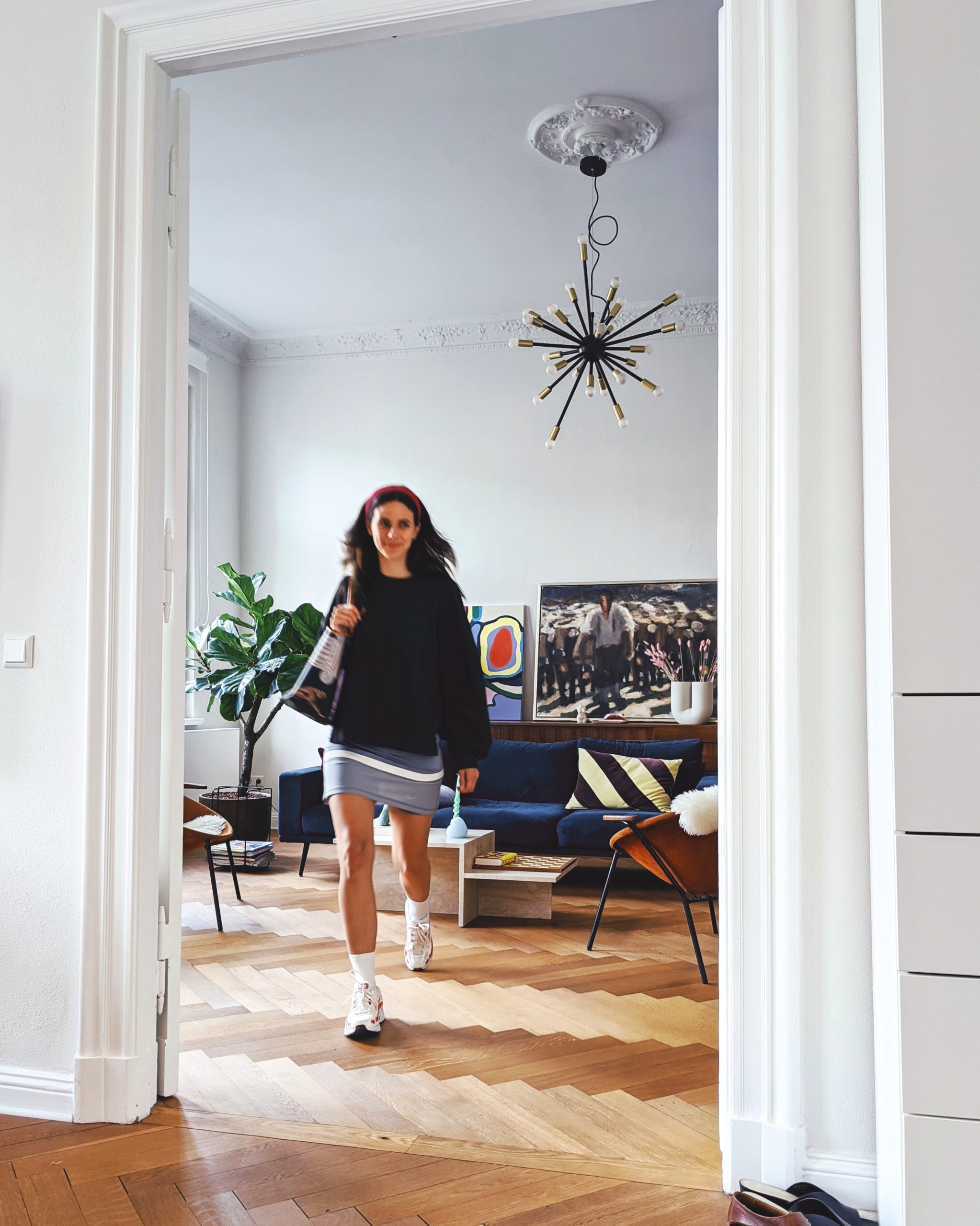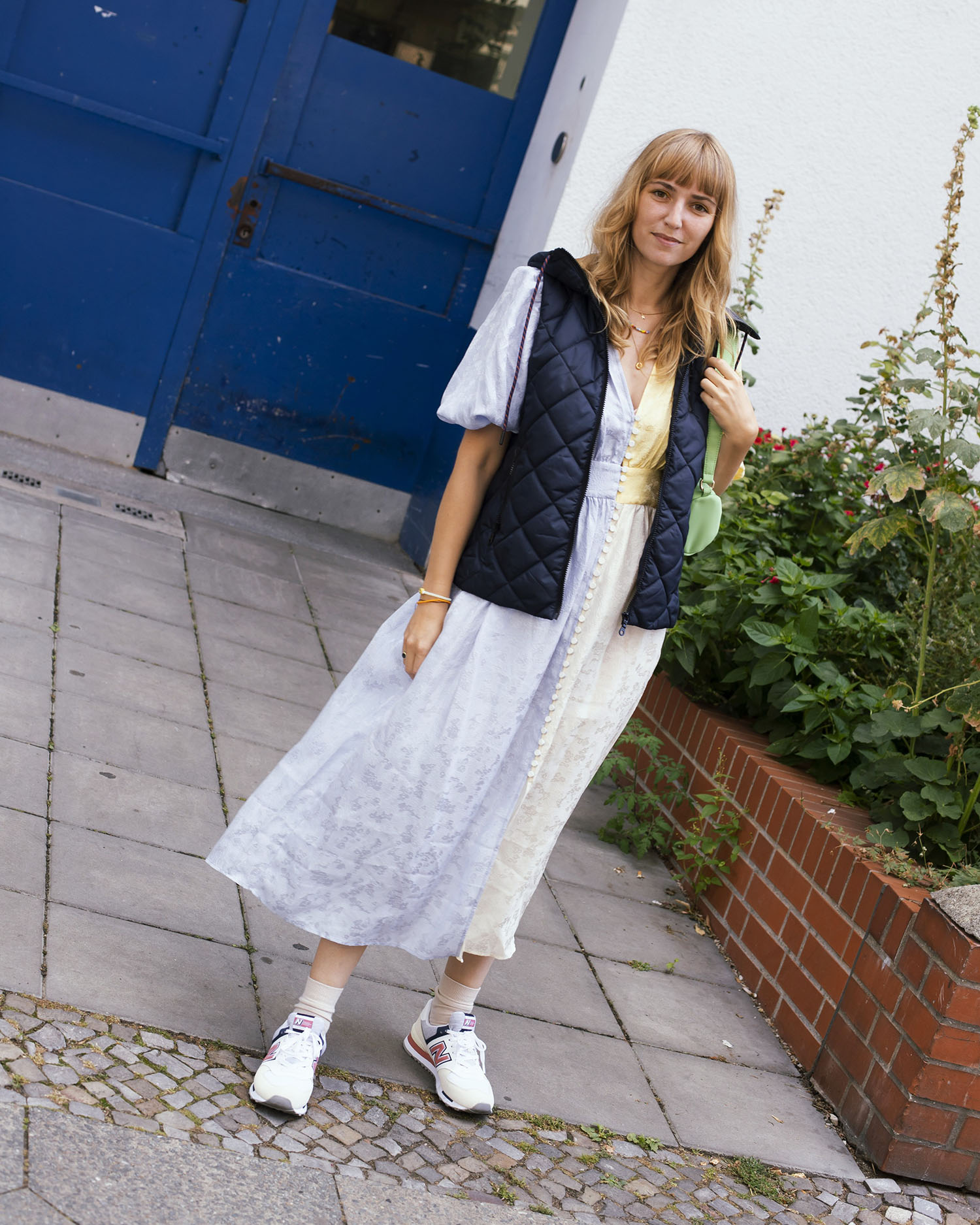 Weste: Baum & Pferdgarten, Kleid: Stine Goya, Tasche: Edited, Schuhe: New Balance