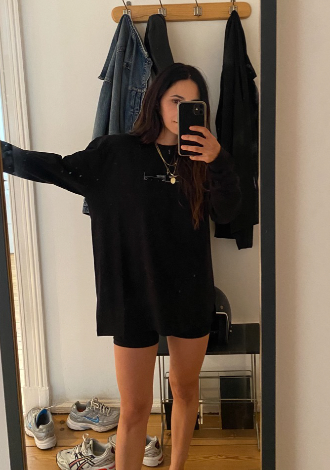 Sweatshirt: Ganni, Rock: Nike, Tasche: Ganni