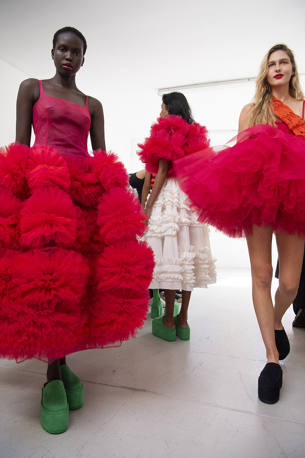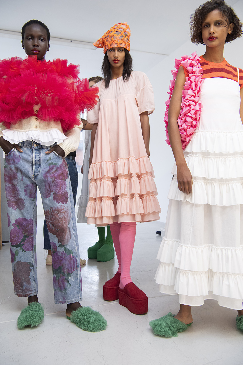 Bereits während der Präsentation der SS21 Kollektion blieb mein Blick immer wieder an den prächtigen Schuhen kleben, während ich mich fragte, ob die flamboyanten Stücke aus eigenem Hause kommen. Jetzt ist es also ganz offiziell: Die Mules, die über Molly Goddards Laufsteg schwebten, stammen aus einer Kollaboration mit dem Schuhlabel Ugg. Mit jeder Menge bunter Farbe und verspielten Elementen setzte die Londoner Designerin ihre Interpretation klassischer Ugg Silhouetten und Materialien um, spielte dabei mit Proportionen, die sich nicht zuletzt in hohen Plateausohlen äußerten. Entstanden sind gleich drei unterschiedliche Schuhe, die sich zwischen Verspieltheit und Eleganz bewegen. Bis wir sie live betrachten können, müssen wir aber noch ein wenig warten, die Kollektion ist erst ab März 2021 erhältlich.