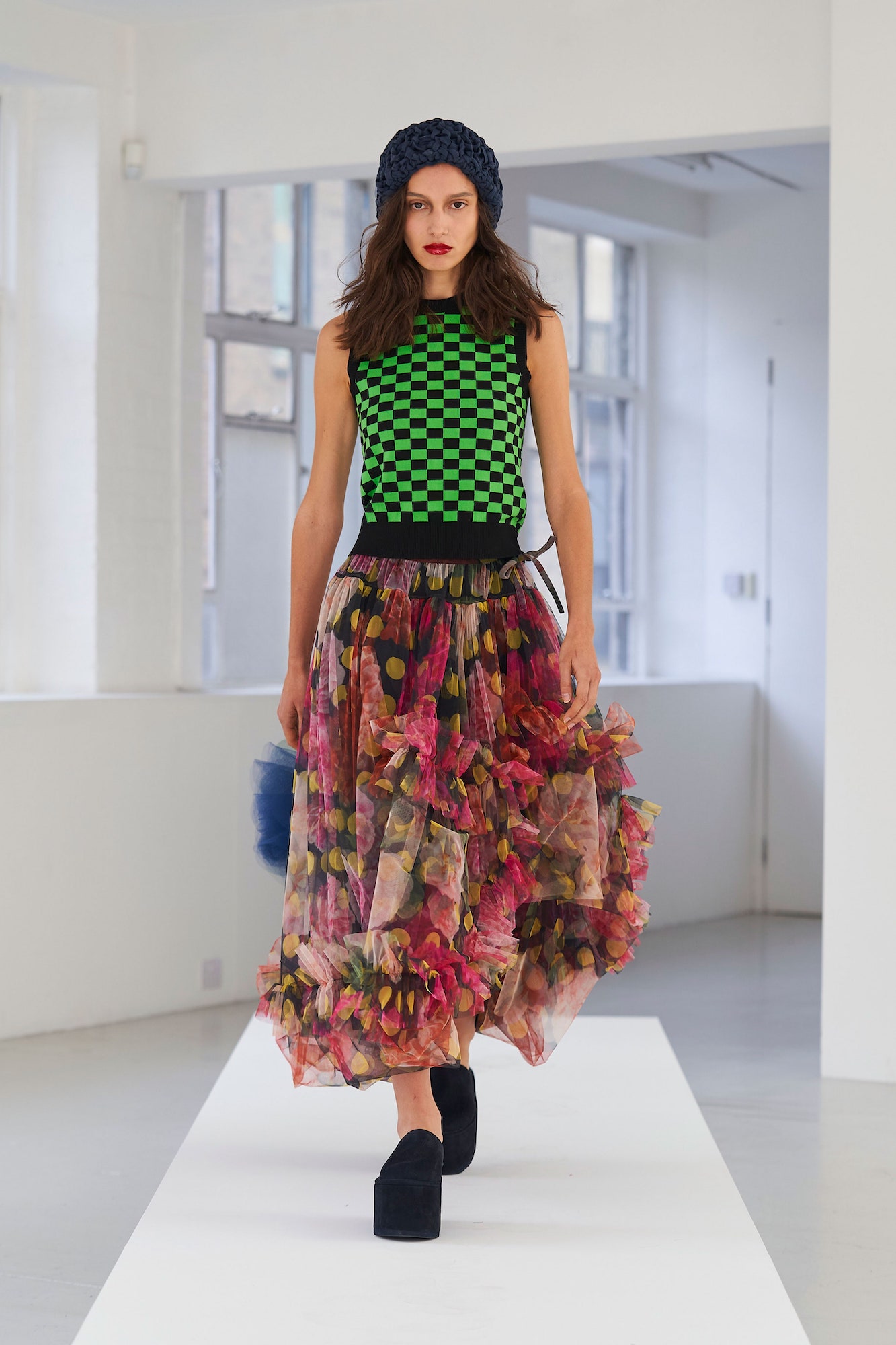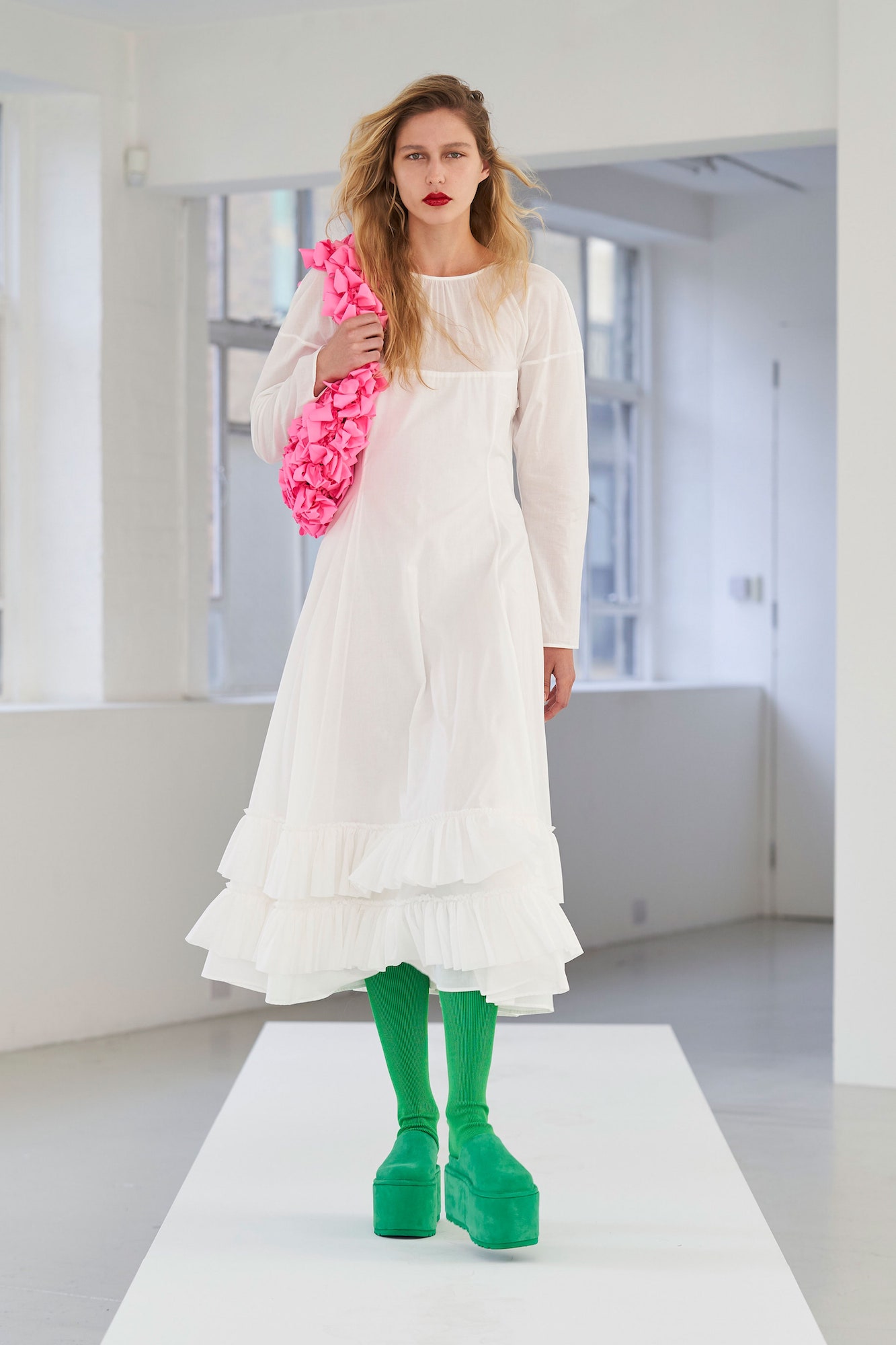 Zur Show: Zu Beginn des Lockdowns schaute sich die Modebranche insbesondere nach simplen Looks um, das Verlangen nach einer neuen Gemütlichkeit wuchs. Auch Molly Goddard dachte zunächst daran, sich cleanen und zurückhaltenderen Designs zu widmen, verwarf die Idee jedoch glücklicherweise und präsentierte ihre SS21 Kollektion schließlich gewohnt farbenprächtig und ausladend via Youtube.