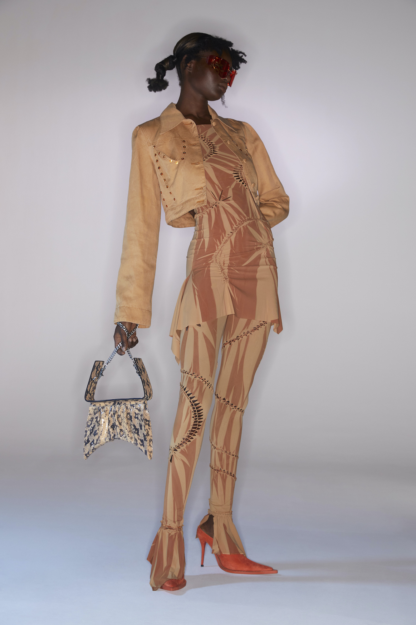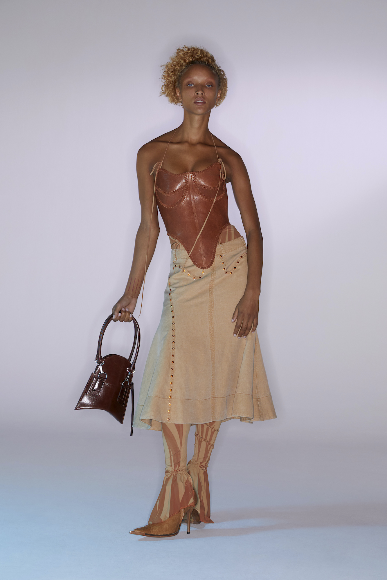 Zur Show: Inspiriert von ihrer Jugend, die sie damit verbrachten, MTV zu schauen, integrierten Charlotte Knowles und Alexandre Arsenault erstmals Jeanshosen in ihre Kollektion. Neu ist in der SS21 Kollektion jedoch nicht nur die Hose, auch nutzten beide Kreative die gezwungene Pause, um ihren Businessplan zu überarbeiten und neue, entschleunigende Techniken zu finden. Das Ergebnis: Während die Handtaschen nun in einer Fabrik, zu deren Kunden auch Dior und Y/Project zählen, hergestellt werden, arbeiteten sie zudem gemeinsam mit TD Kent an handbemalten, futuristischen Sonnenbrillen.