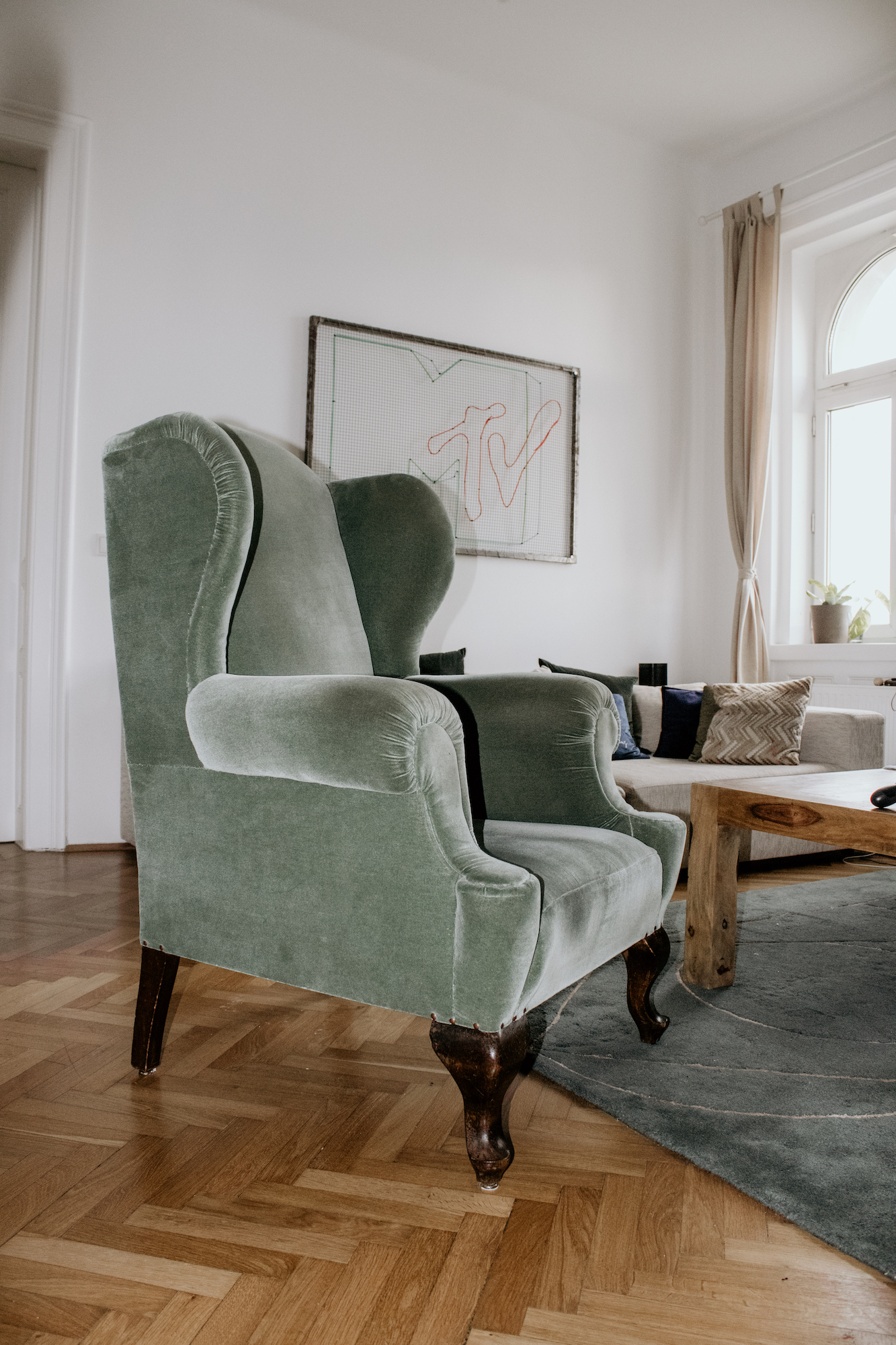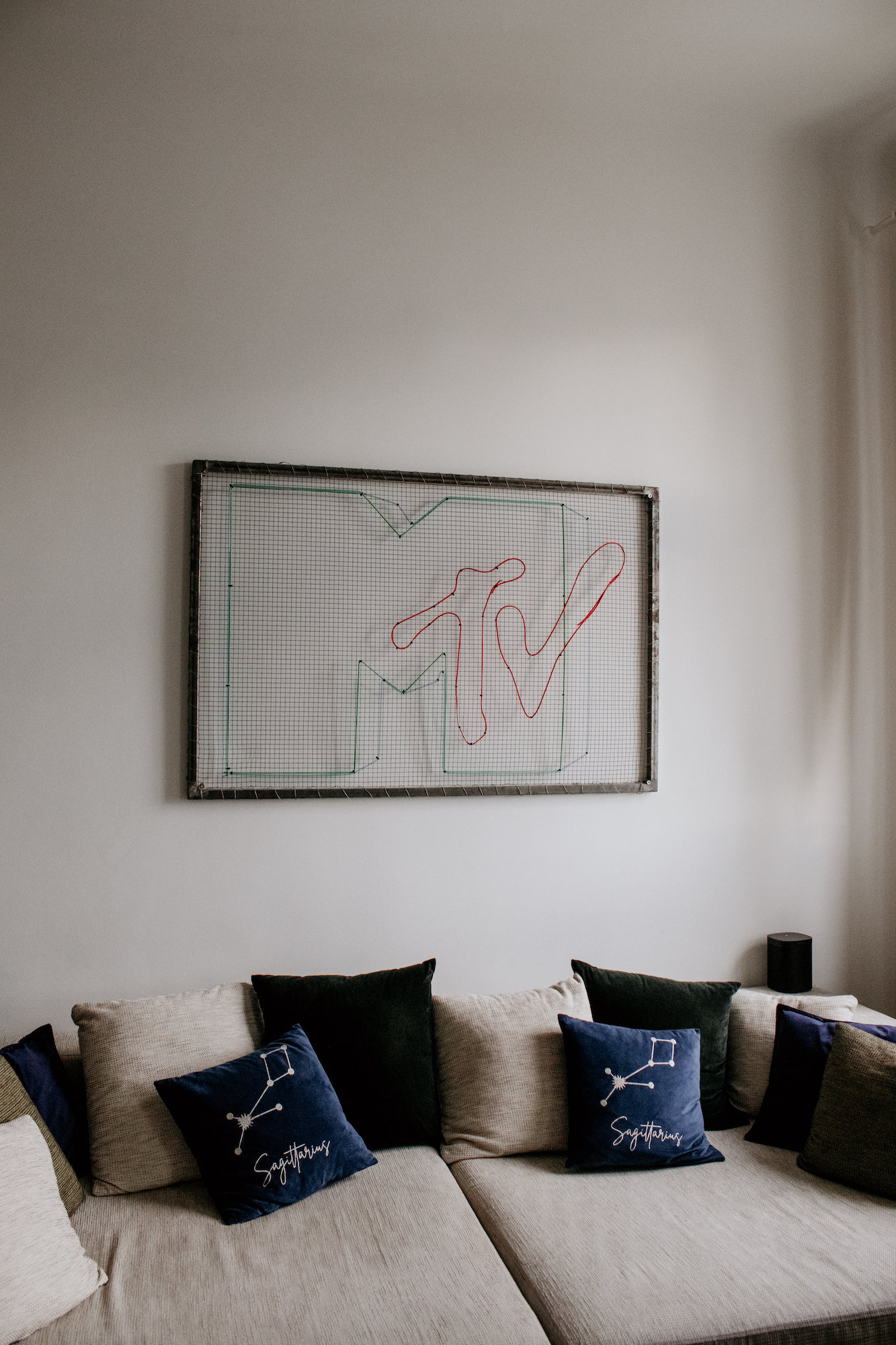 Ich werde regelmäßig von meinen Followern auf das MTV-Bild angesprochen, dass über unserem Sofa hängt. Das ist aus der Zeit, in der Markus in der Schweiz bei MTV gearbeitet hat. Es war ein Geschenk und er hat es Gott sei Dank aufgehoben. Es ist der Stilbruch, den unser Wohnzimmer braucht.