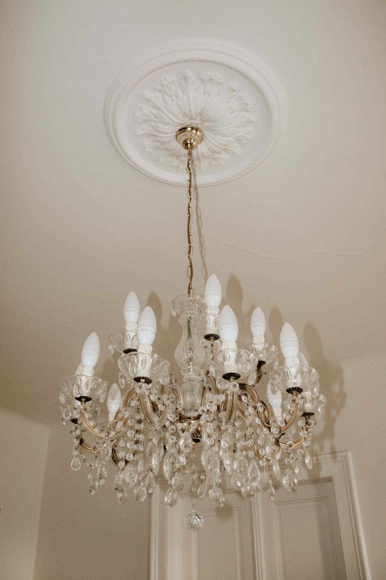 Wir waren kurz davor eine horrende Summe für einen Glasluster zu bezahlen, als meiner Schwiegermutter eingefallen ist, dass irgendwo im Keller noch der Luster der Uroma herum liegen müsste, den keiner wollte … außer uns! Mittlerweile haben wir heraus gefunden, dass es sich um einen Kristallkronleuchter im Maria Theresien Stil handelt, der perfekt in unser Wohnzimmer passt.