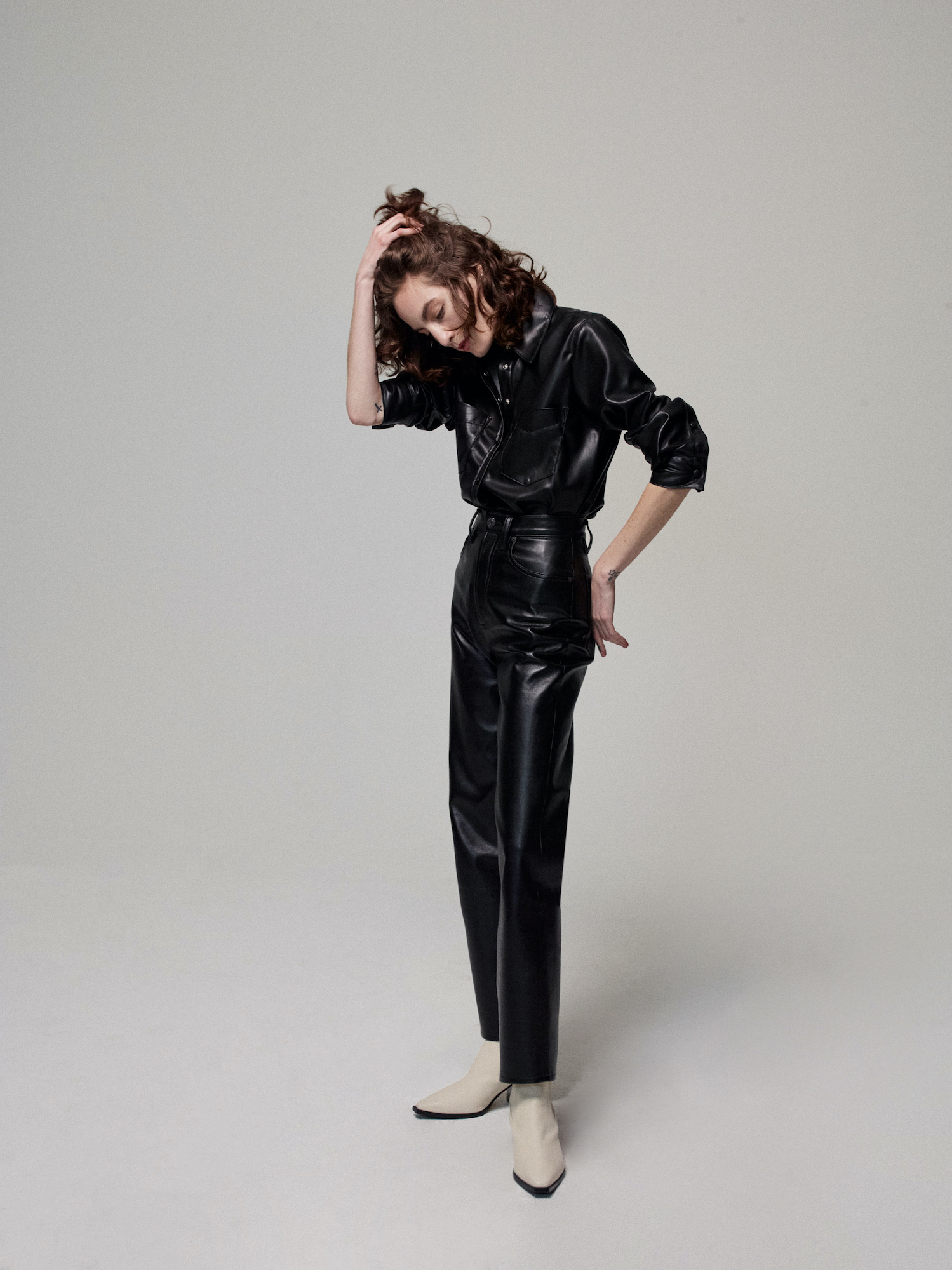 In diesem Herbst präsentiert Agolde erstmals eine neue Kategorie, die sich in Form von Kleidungsstücken aus recyceltem Leder zeigt. Das Besondere: Die Kollektionen werden aus kleinen Stücken und Abfällen, die in Gerbereien anfallen und zuweilen auf dem Müll gelandet wären, produziert. Dabei werden die Reste gesammelt und in einem Shredding-Prozess zu einer sogenannten „Leder-Wolle“ gefertigt. Aus dieser wird anschließend das finale Material gewonnen. Neben Lederhosen in Schwarz und Weiß lanciert Agolde ebenfalls passende Hemden — einen ersten Vorgeschmack bekommt ihr bereits durch das Lookbook: