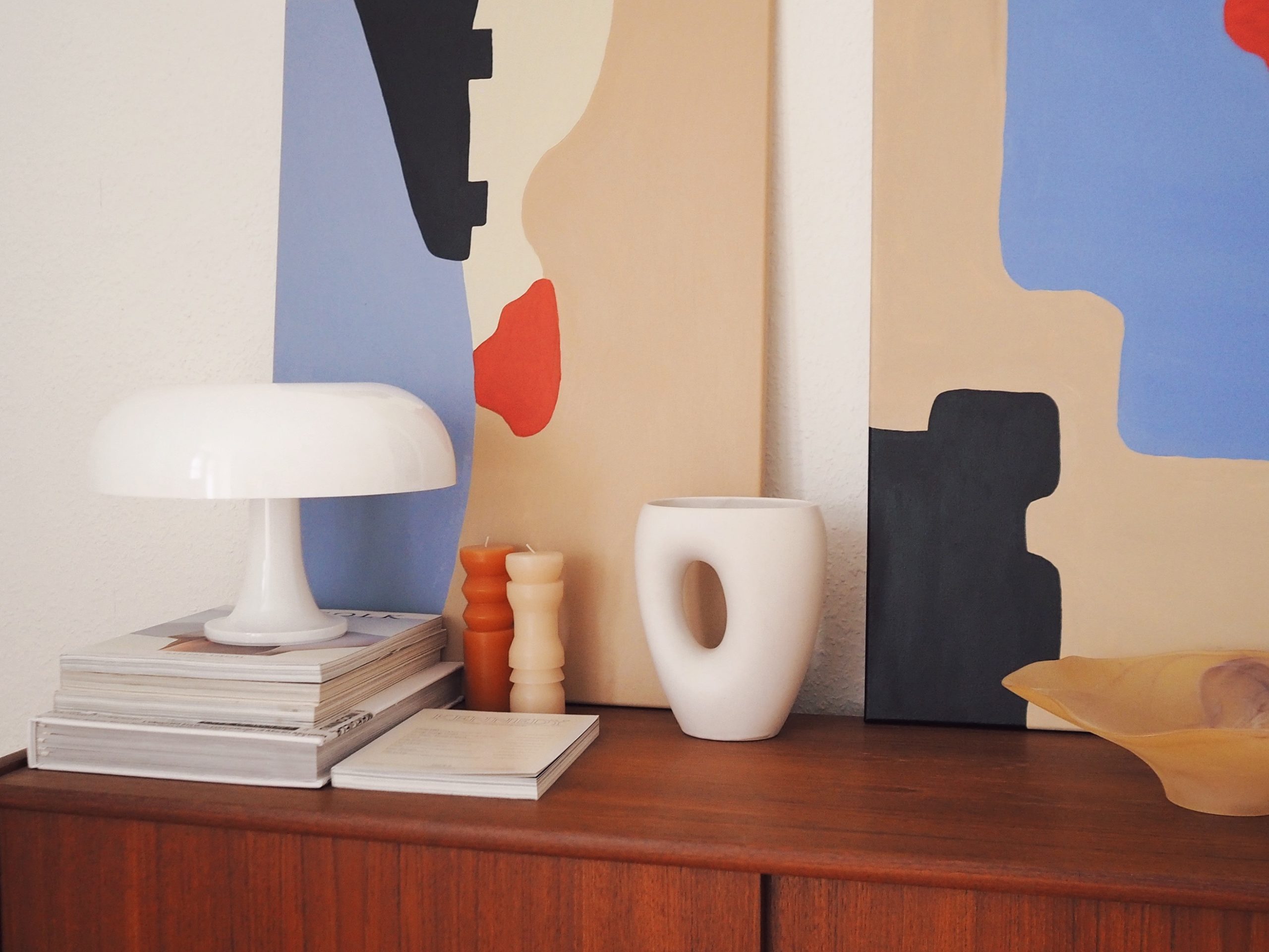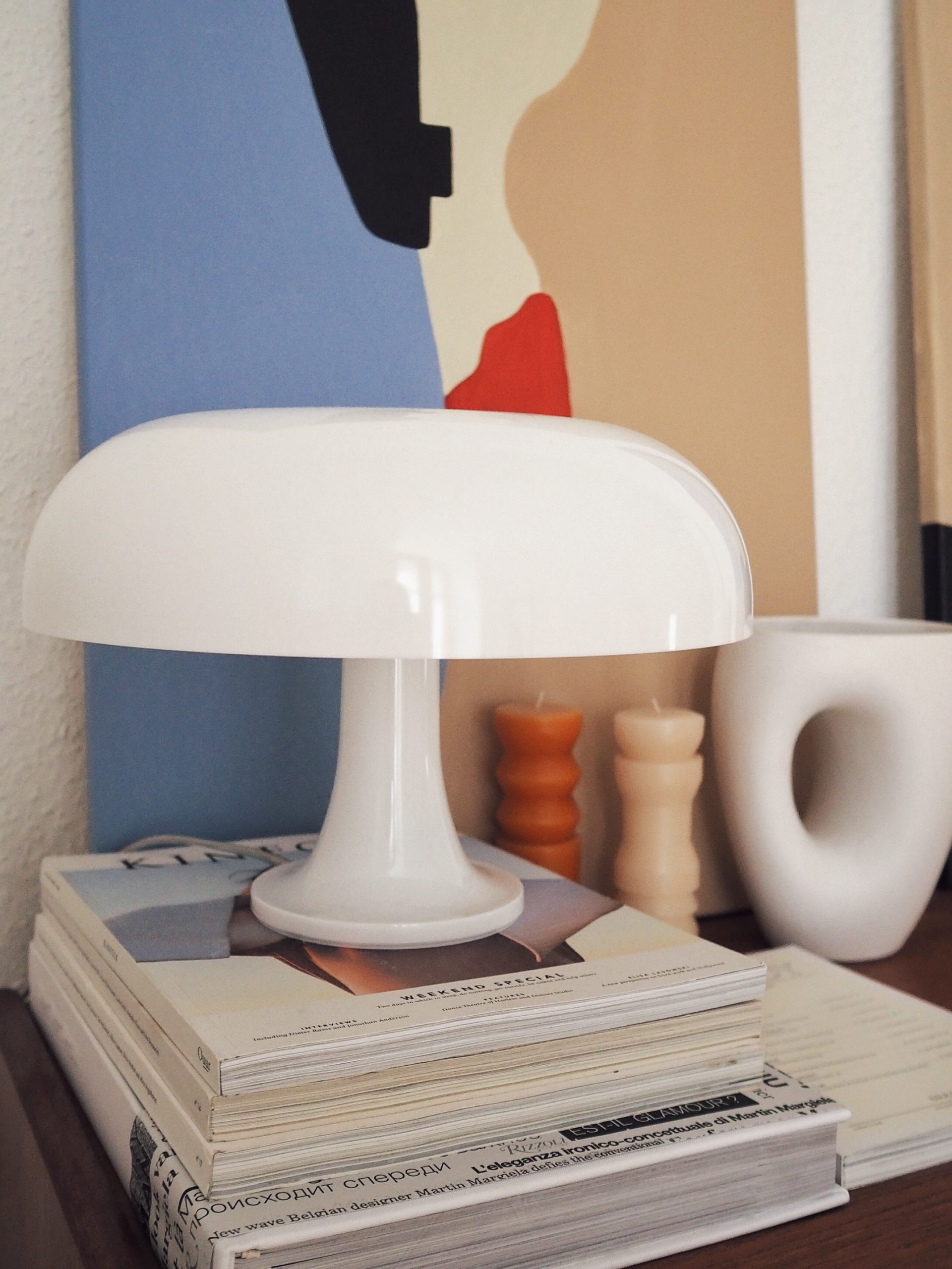 Eine jede Veränderung beginnt natürlich mit der Evaluation der aktuellen Situation. In meinem Fall heißt das: Die nackte Kommode in der dunklen Ecke ist der erste Ort, der ein wenig mehr Licht vertragen kann. Diese Erkenntnis grenzt meine Lampensuche glücklicherweise bereits ziemlich ein, denn die einzigen Exemplare, die jetzt infrage kommen, sind: Ganz genau, Tischleuchten. Und weil es da schon seit einer gefühlten Ewigkeit ein ganz bestimmtes Modell gibt, in das ich mich einst Hals über Kopf verliebte, fiel mir die Entscheidung — anders als erwartet — plötzlich auch gar nicht mehr schwer. Mein Herzblatt: Die kleine Nessino von Artemide gehüllt in klassisches Weiß.