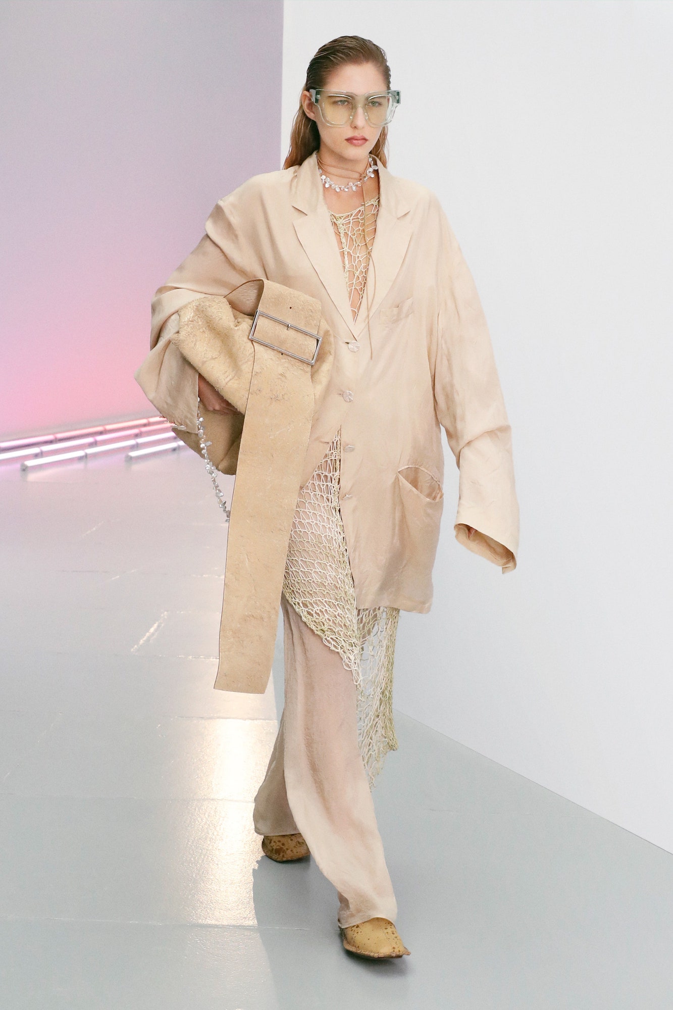 Davon gab es reichlich: Blazer in weiten Silhouetten und große, transparente Sonnenbrillen.