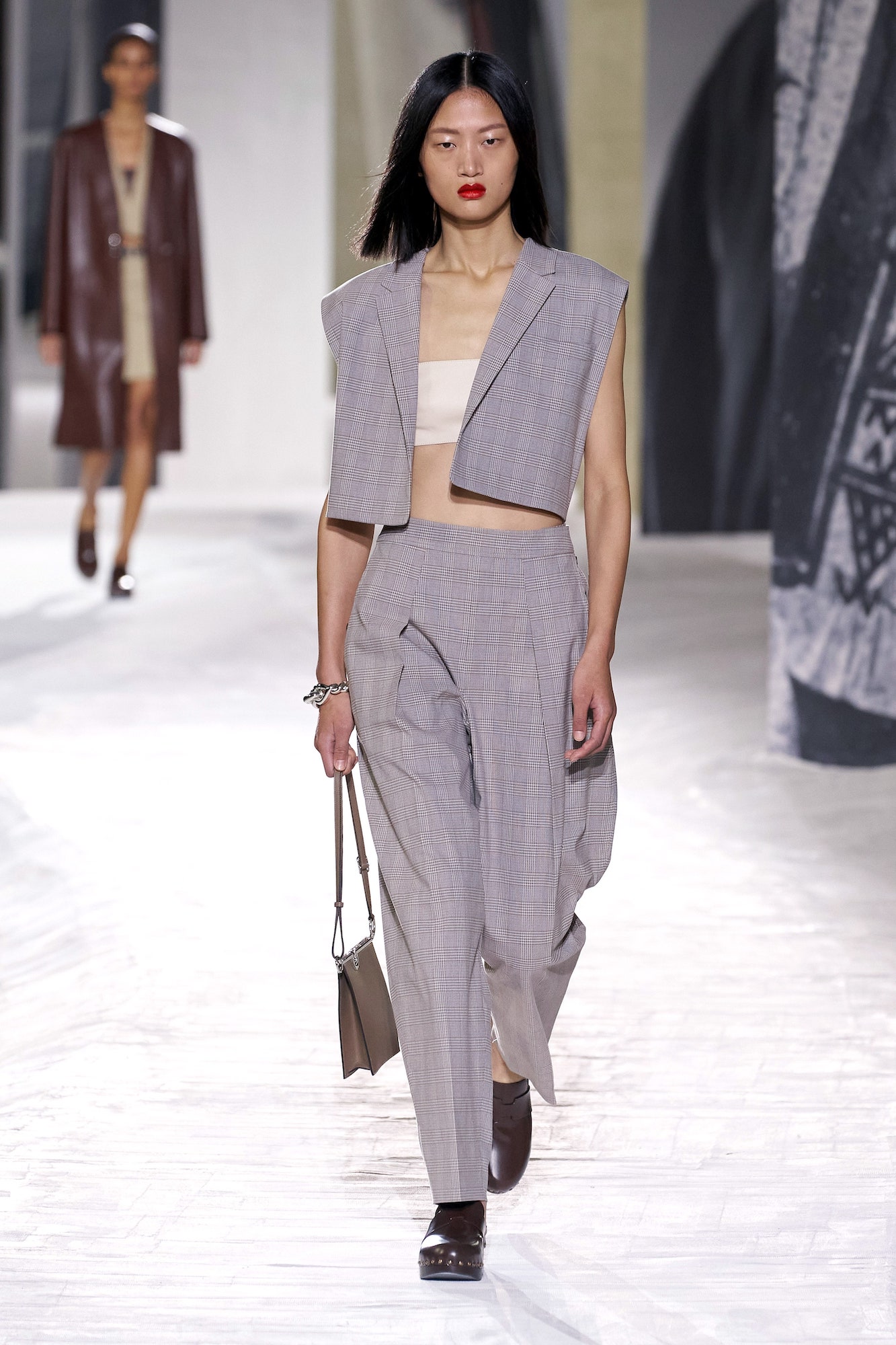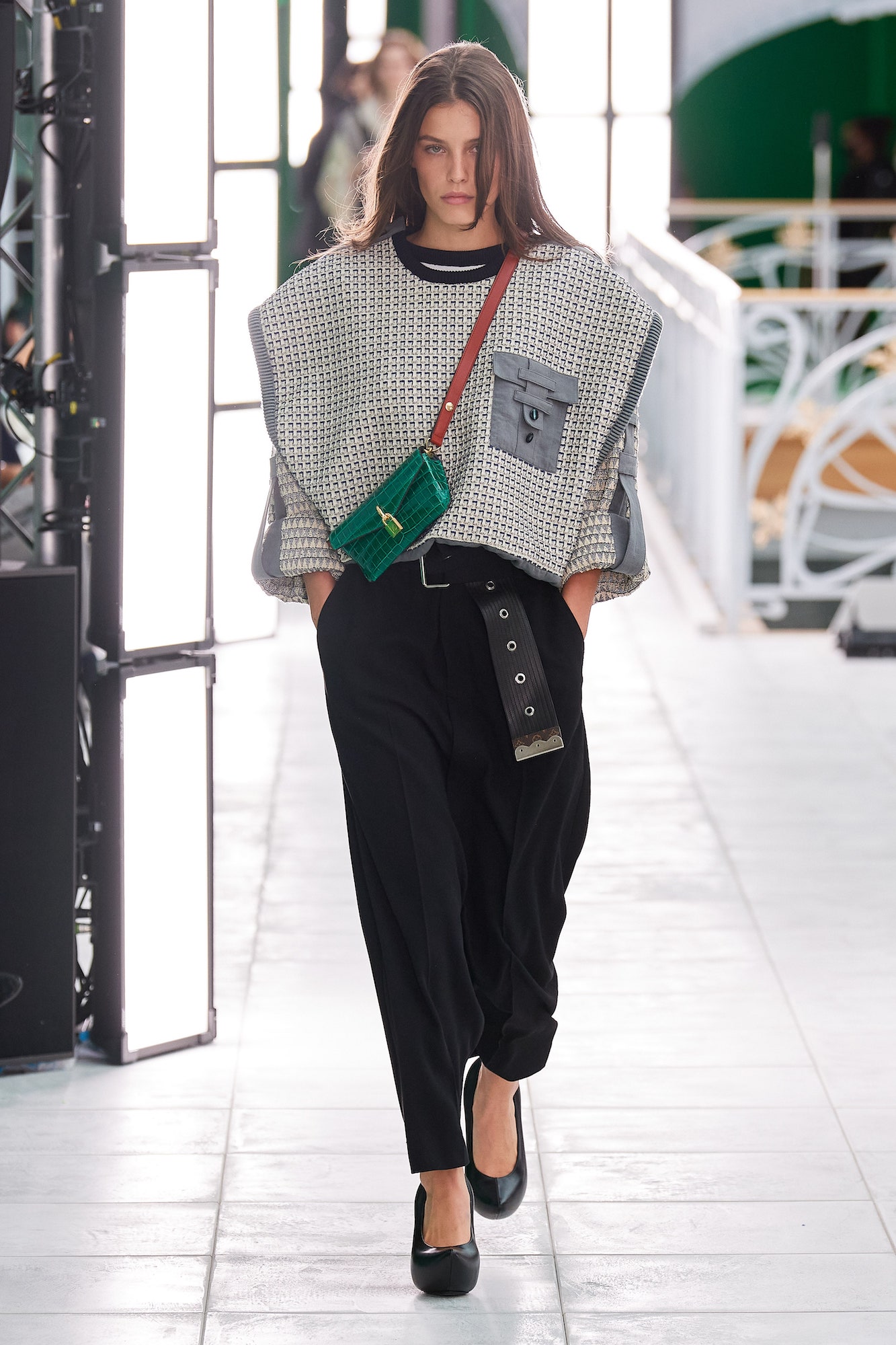 Zur Show: Nicolas Ghesquière zeigte seine Kollektion für Louis Vuitton im renovierten LVMH La Samaritaine Kaufhaus, lud dazu gleichermaßen Live-Publikum, als auch ein digitales ein. Das Besondere: 360-Grad-Kameras ermöglichten es den Zuschauer*innen, die Models auch zu Hause kommen und gehen zu sehen und die gesamte Umgebung wahrzunehmen. Für einen zusätzlichen Effekt sorgten die Green Screens, die an den Wänden und zum Teil auch auf dem Boden verliefen — im Livestream wurden an diesen Stellen Ausschnitte aus Wim Wenders „Wings of Desire“ abgespielt.