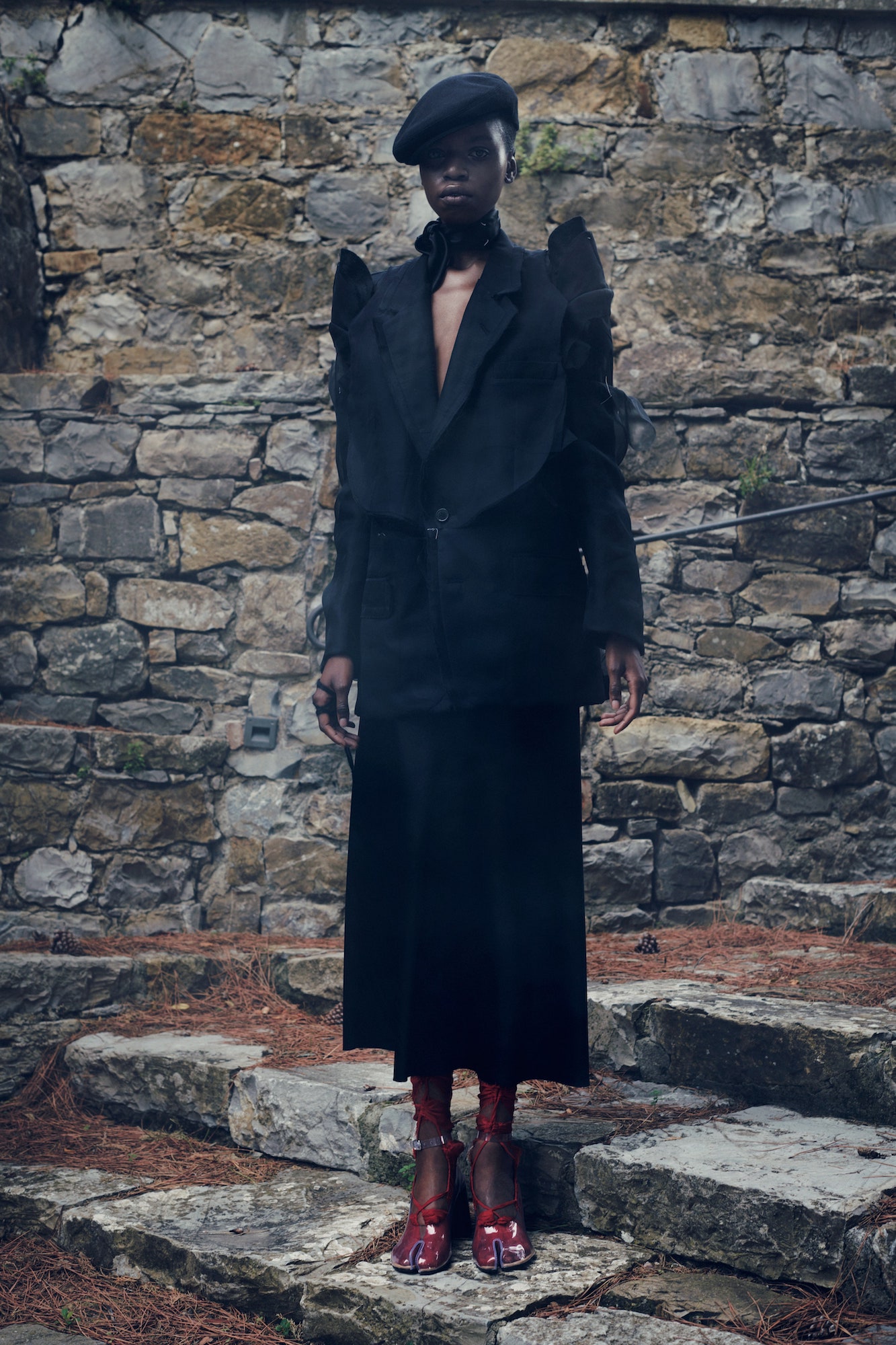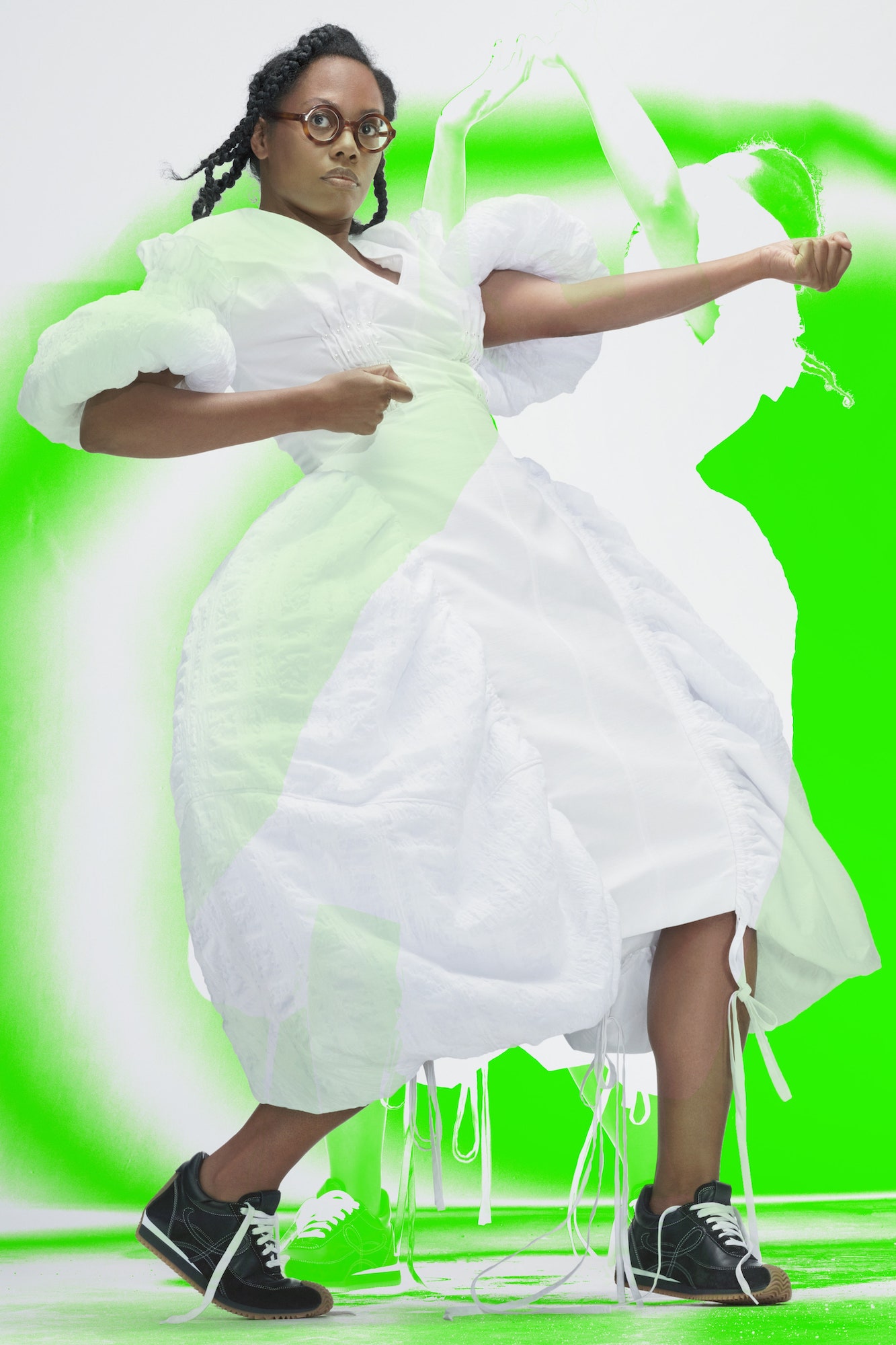 Zur Show: Als Thebe Magugu „Betrayal: The Secret Lives of Apartheid Spies“ von Jonathan Ancer las, lernte er erstmals über verdeckte Agenten Süd Afrikas und wie ihre Arbeit eine ganze Nation beeinflusste. In einem Interview erzählte der Designer davon, dass Spione vielmehr als unsere Freund*innen, Familien, Lehrer*innen und Mütter unter uns leben, statt den populären Bildern zu entsprechen. Für seine SS21 Kollektion ließ er sich schließlich von Frauen wie etwa der Spionin Olivia Anne Marie Forsyth, die im Sicherheitszweig der südafrikanischen Polizei arbeitete, inspirieren. In seiner Kleidung spiegelte sich all das etwa in Polka Dots, die eigentlich Fingerabdrücke Forsyths sind, oder Zick-Zack-Mustern, die einem Lügendetektortest entsprangen, wider.