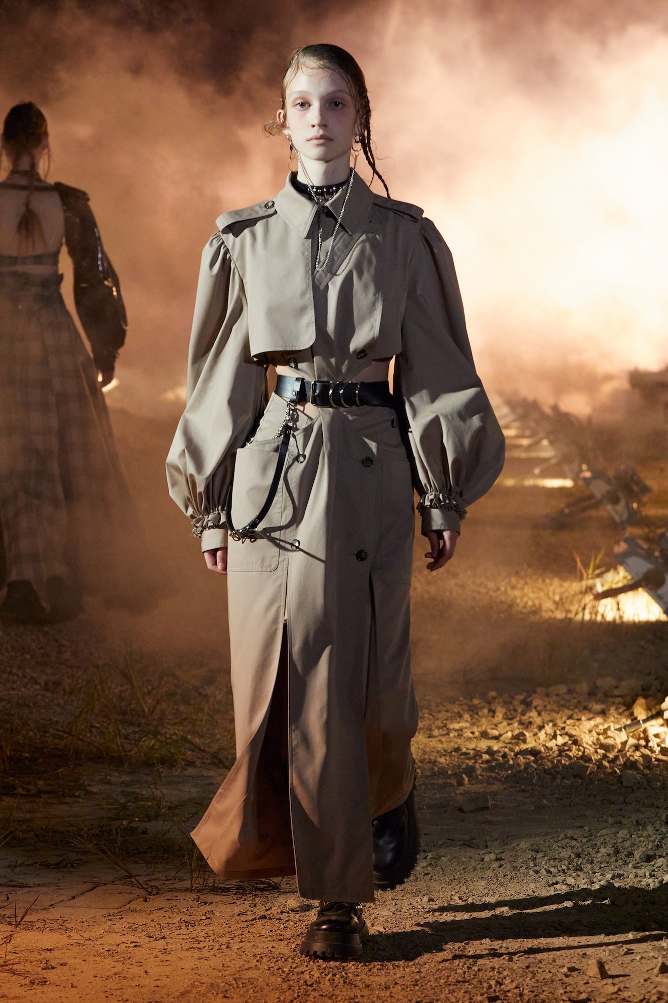 Zur Show: Rok Hwangs SS21 Kollektion wurde in Form eines Videos, das nicht etwa ein Endzeitszenario, sondern vielmehr eine Flucht in eine andere Welt, darstellt, präsentiert. Inspiriert von „Miss Peregrine’s Home for Peculiar Children“ kreierte Rokhs Designer imaginäre Welten, die sich letztlich auch durch seine Kollektion „Night Wanderers“ zogen.