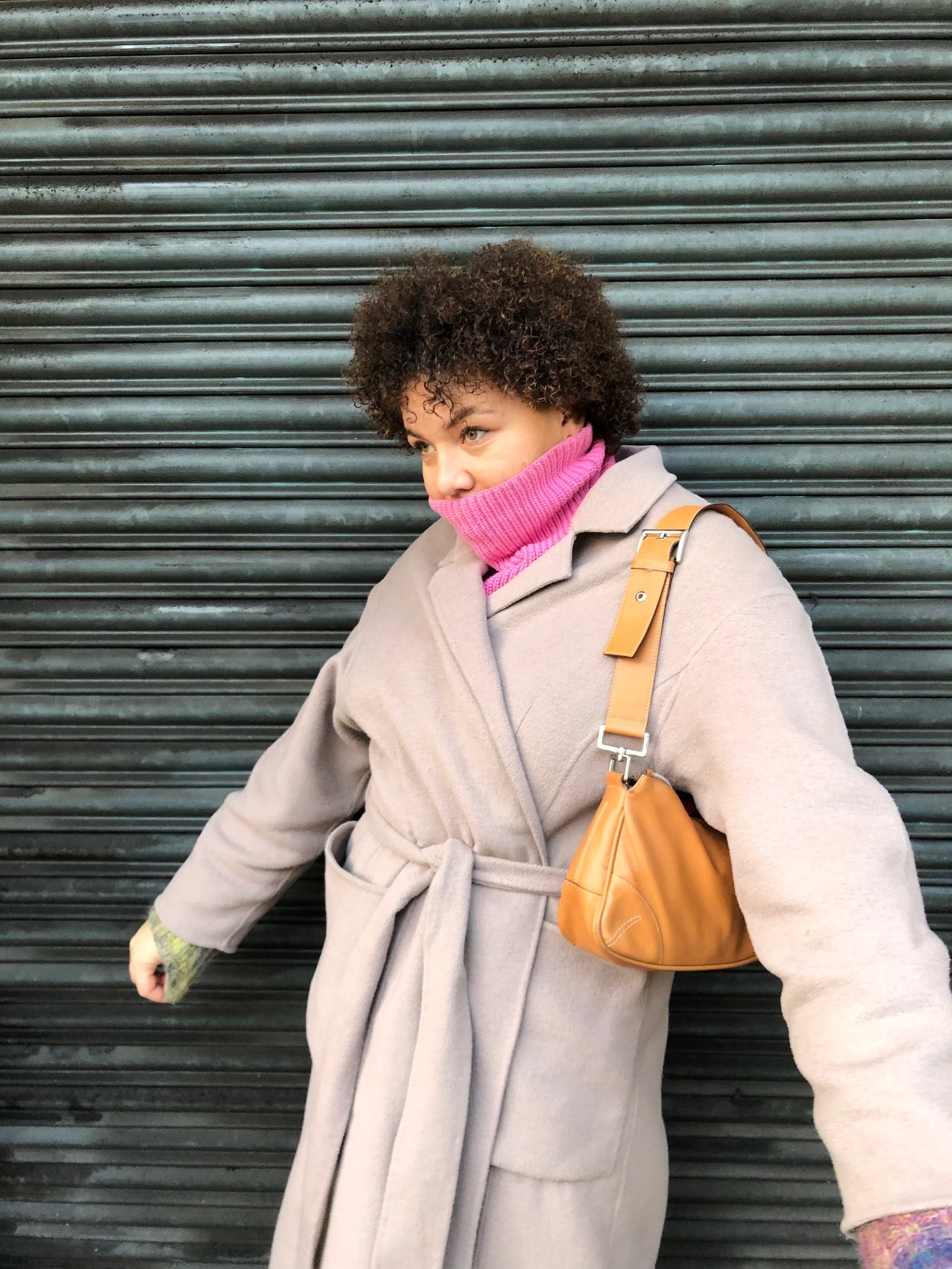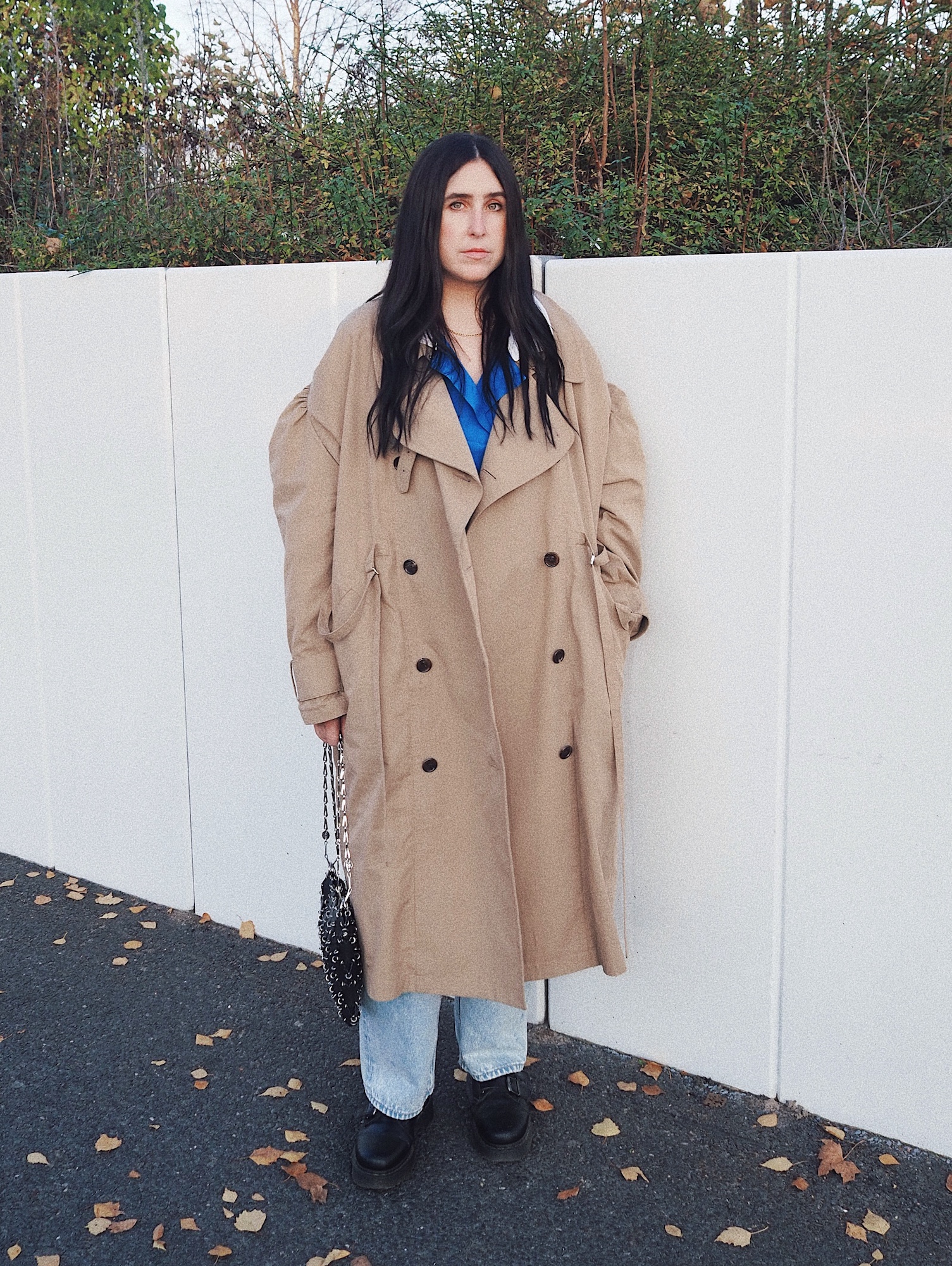 rechts: Trenchcoat: Pushbutton (alt), Jeans: Eytys (alt), Schuhe: Dr. Martens (alt), Tasche: Paco Rabanne via Vestiaire Collective