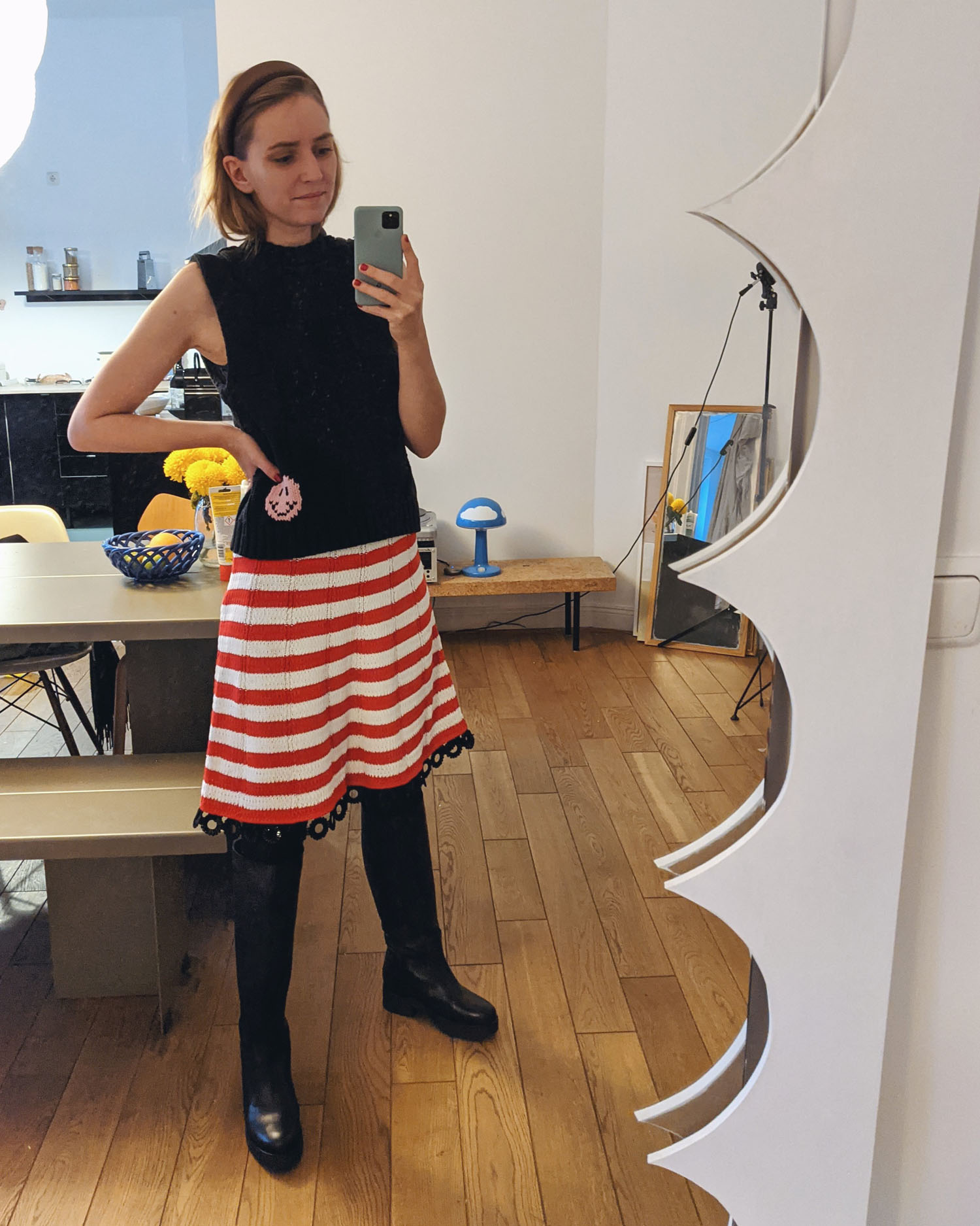 Willkommen im Chaos Teil 239344. Pullunder: Ganni, Rock: Miu Miu, Stiefel: Edited, Haarreifen: KDG x Jane Wayne