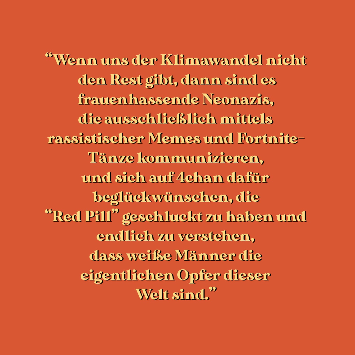 Denn seien wir mal ehrlich: So richtig geil war das echte Leben noch nie. Die Menschen, die man liebt, sterben. Wer nicht weiß, heterosexuell, cis ist, wird dafür angegriffen, verfolgt, diskriminiert. Vielleicht lebt man mit einer Krankheit, vielleicht in Armut, vielleicht in einem Kriegsgebiet, vielleicht auch alles auf einmal. Und selbst wenn man sich gemütlich unter dem gerahmten “Hygge”-Bild in seiner Eigentumswohnung eingemummelt hat, die immer sauber ist, weil man anderen Menschen Geld dafür gibt, dass sie für einen Haare aus dem Duschabfluss fischen – irgendwas ist ja immer. Wenn uns der Klimawandel nicht den Rest gibt, dann sind es frauenhassende Neonazis, die ausschließlich mittels rassistischer Memes und Fortnite-Tänze kommunizieren, und sich auf 4chan dafür beglückwünschen, die “Red Pill” geschluckt zu haben und endlich zu verstehen, dass weiße Männer die eigentlichen Opfer dieser Welt sind. Cool, cool. cool. Kann ich die blaue Pille nochmal sehen?