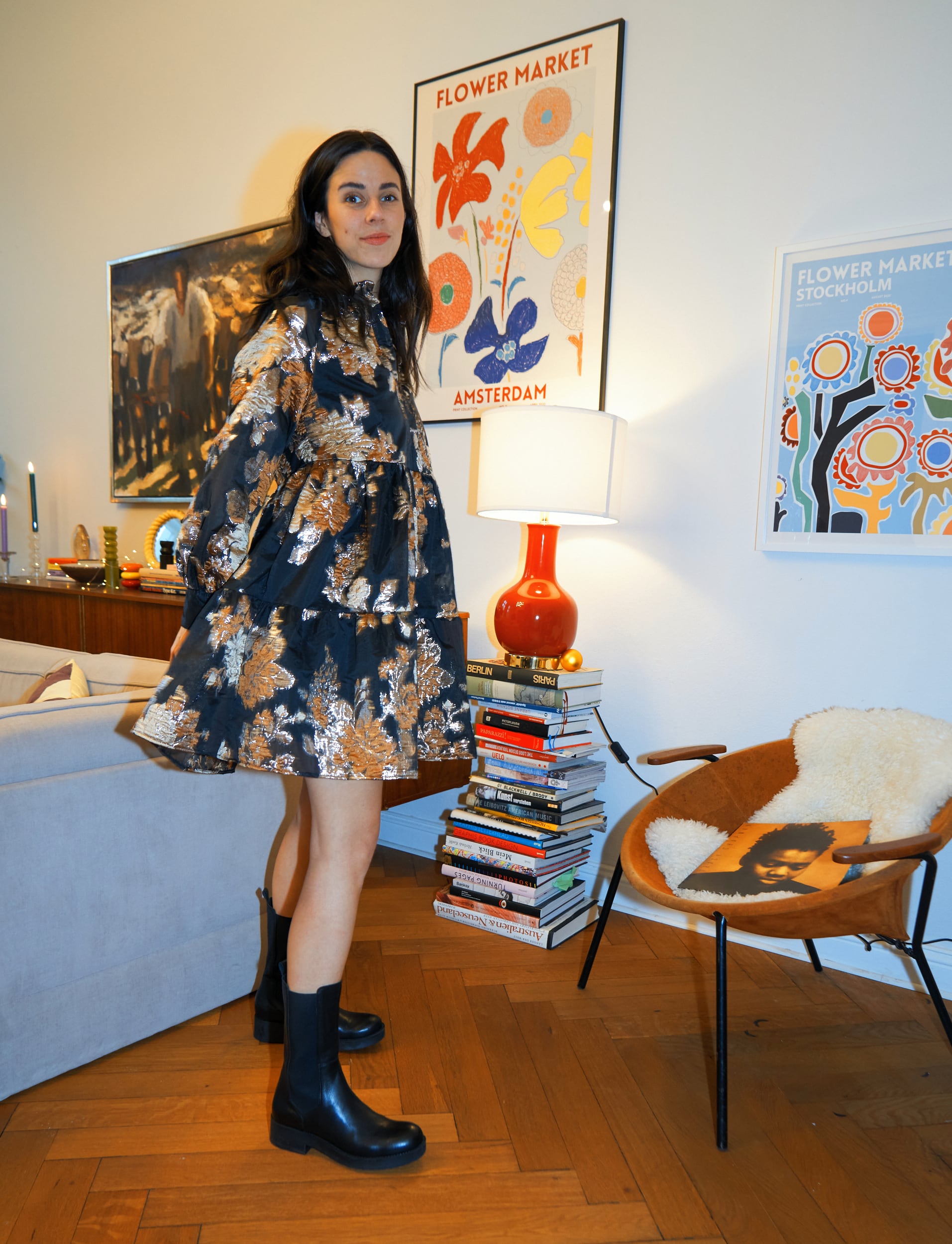 Blazer: Maison Margiela (alt), Kleid: Raey (alt), Schuhe: MM6 (alt), Tasche: Paco Rabanne via Vestiaire Collective