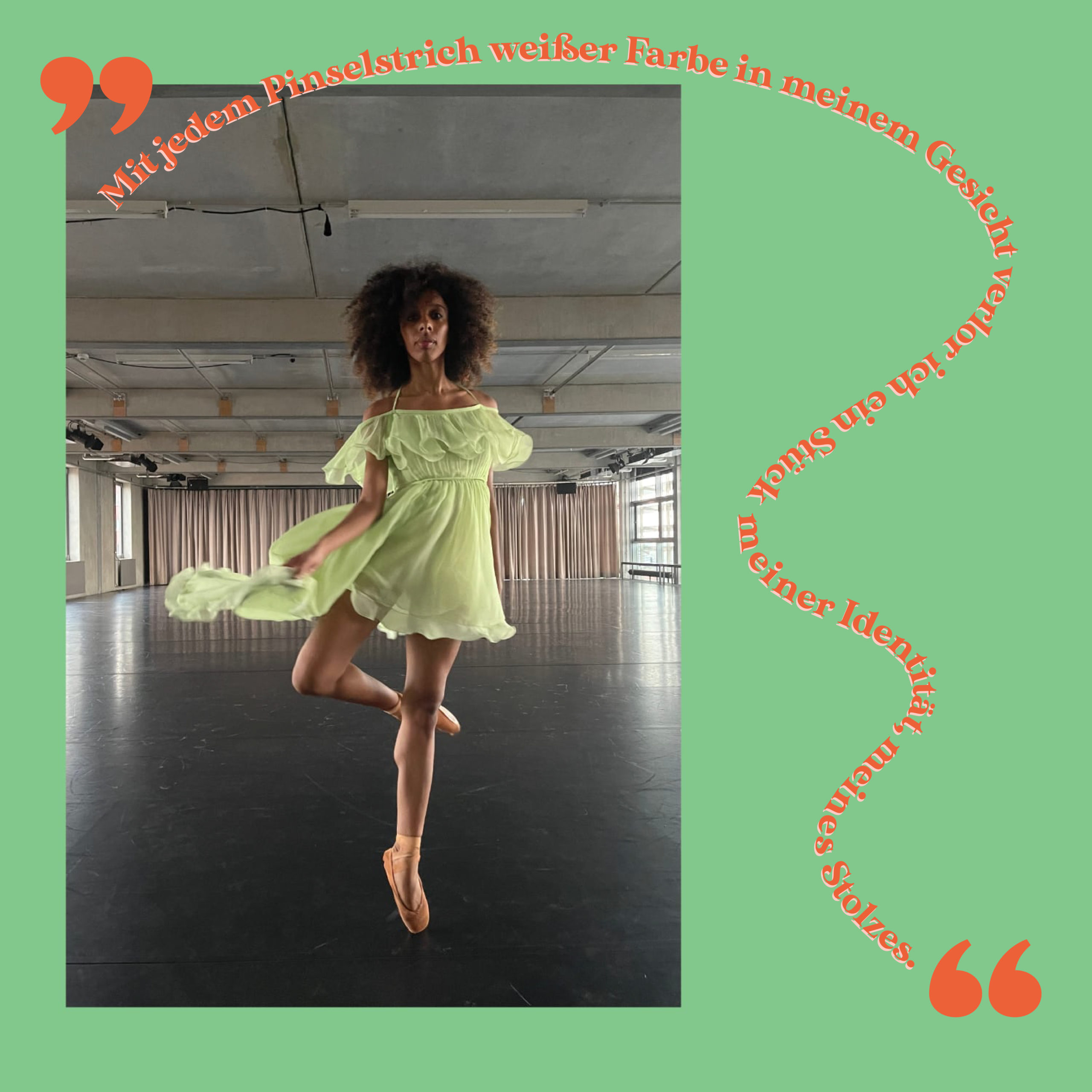 Das scheinen dort nicht alle so zu sehen. Ich entspreche nicht der Norm des Ensembles: Ich bin die einzige Ballerina of Color von 91 TänzerInnen am Berliner Staatsballett. Das bekam ich auch öfters schmerzhaft zu spüren. Schon bei meinem Vorstellungsgespräch sprach sich eine Ballettmeisterin gegen mich aus. Es würden auf der Bühne alle nur auf mich sehen, da ich so auffalle. So traurig es klingt: Diese rassistische Einstellung ist nicht untypisch für das traditionelle Ballett der Generation 60+. Wie traurig, sollte doch Ballett unsere Gesellschaft widerspiegeln, mit all ihren Hautfarben.