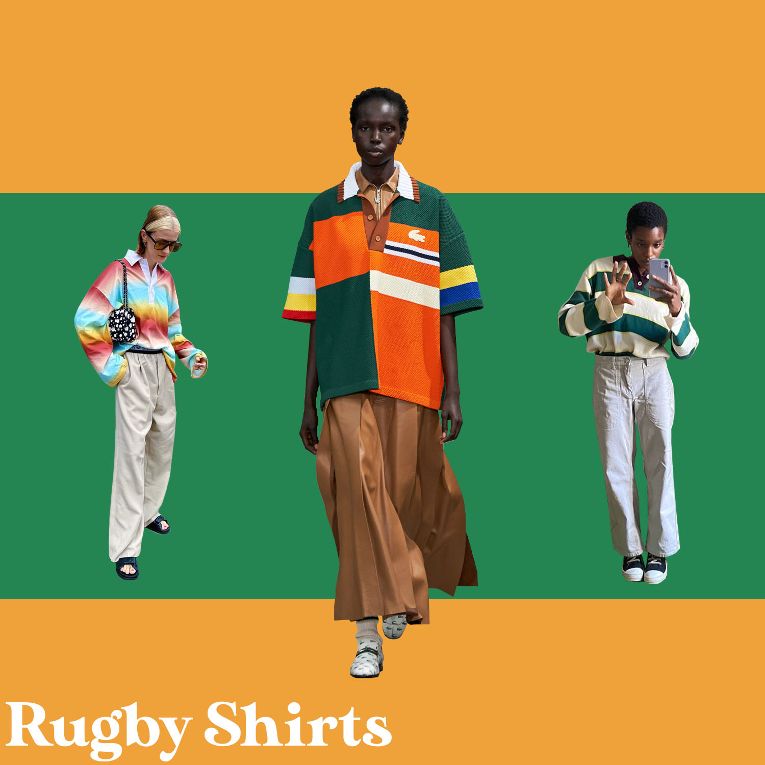 So fanden sich im Laufe der Zeit natürlich auch fernab der Laufstege sämtliche Variationen, die von Pullovern im Rugby-Stil und langen Hemdkleidern bis hin zum klassischen Trikot reichen. Die vielleicht prominentesten Träger*innen: David Hockney, Mick Jagger, Nelson Mandela und Prinzessin Diana. Heute sind die Shirts dank Ganni, Acne Studios und Kule — der neueste Mode-Liebling auf Instagram — mittlerweile regelmäßig auf den Straßen und somit auch in den sozialen Medien zu sehen. Mal leuchten sie in bunten Regenbogenfarben, mal sind sie von Glitzerknöpfen verziert oder weichen bloß minimal vom traditionellen Sport-Shirt ab. Getragen werden sie zur Jeans, über den Rock oder gleich als Kleid und präsentieren sich selbst zur Blümchentasche als eine Art Gegenentwurf zu verspielteren Designs, die zuletzt vorwiegend zu sehen waren.