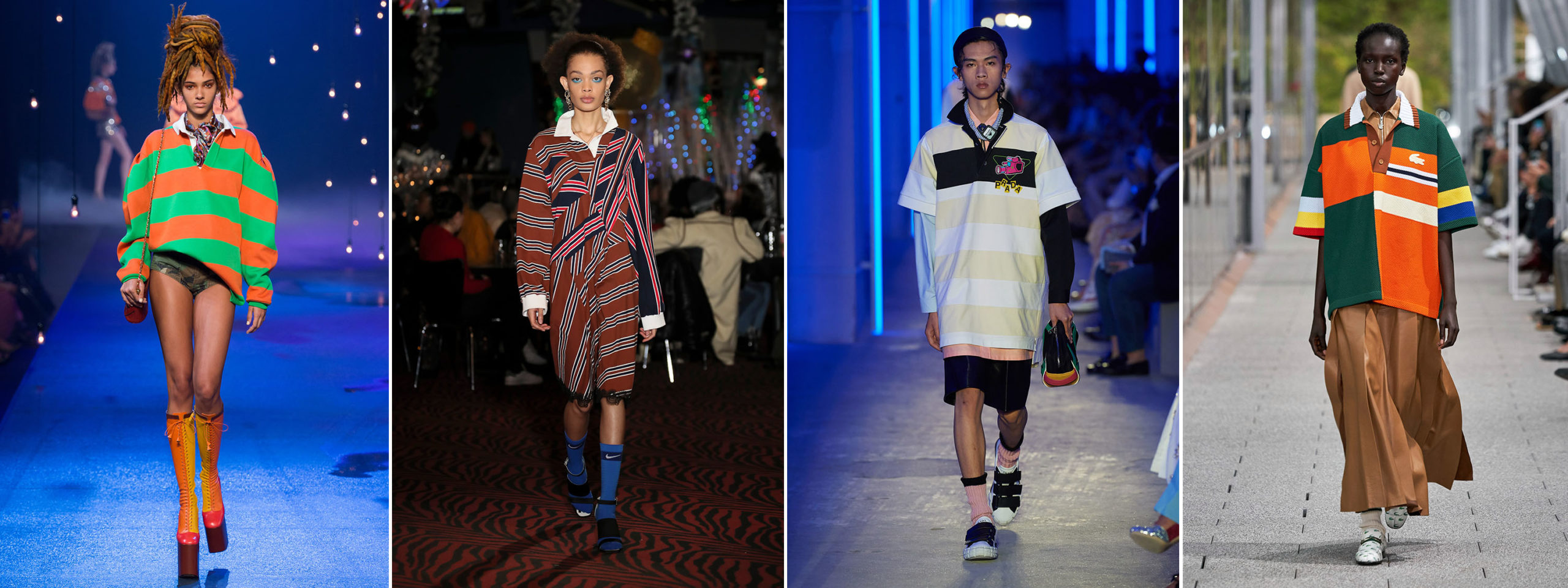 Während J.Crew und Ralph Lauren schon lange für ihre verschiedenen Ausführungen des Rugby Shirts bekannt sind, fand das Sportoberteil seinen Weg mit der Zeit auch auf den Laufsteg: Zunächst zählte es lediglich in der Männermode − etwa bei Sunnei, Gucci und Prada − zum festen Repertoire, mittlerweile erscheint es jedoch auch in diversen Womenswear-Kollektionen: So präsentierte Marc Jacobs während der New Yorker Modewoche im September 2016 ein grün-orange gestreiftes, weit geschnittenes Rugby Shirt inklusive leuchtend weißem Kragen und griff dabei die wohl typischsten Elemente des ursprünglichen Kleidungsstücks auf. Gleich mehrere Designs gab es einige Jahre später während der Pre Fall sowie Fall / Winter 2019 Schauen zu sehen: Sowohl Koché als auch Burberry näherten sich dem Trikot in Form von knielangen Midi-Kleidern, setzten jedoch ebenfalls auf das unverkennbare Streifenmuster. Ein wenig mehr Länge fügte Jonathan Anderson vergangene Saison unter Loewe hinzu, die leicht ausgestellten Maxi-Kleider schafften es zwar nicht auf den Laufsteg, dafür jedoch unmittelbar in den Verkauf. Eine der vielleicht schönsten Varianten sah man im Herbst 2019 wohl bei Lacoste: Das Label, das einst insbesondere für seine Tennis-Kleidung bekannt wurde, zeigte im Rahmen seiner Spring Summer 2020 Kollektion ein bunt gemustertes, weit geschnittenes Design und kombinierte es kurzum zum hellbraunen Lederkleid sowie flachen Loafers: Spätestens jetzt war das das Rugby Shirt im Alltag angekommen. Und auch in einer diesjährigen Frühjahrskollektion fand der sportive Stil wieder einen Platz: So verpasste Ganni seiner eigenen Interpretation aus Strick glitzernde Knöpfe in Blumenform und brachte das Rugby Shirt zumindest in den sozialen Medien in die breitere Masse.