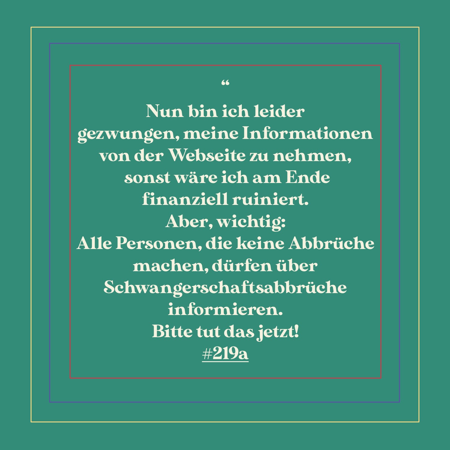 Nun bin ich leider gezwungen, meine Informationen von der Webseite zu nehmen, sonst wäre ich am Ende finanziell ruiniert. Aber, wichtig: Alle Personen, die KEINE ABBRÜCHE MACHEN, dürfen über Schwangerschaftsabbrüche informieren. Bitte tut das jetzt! #219a