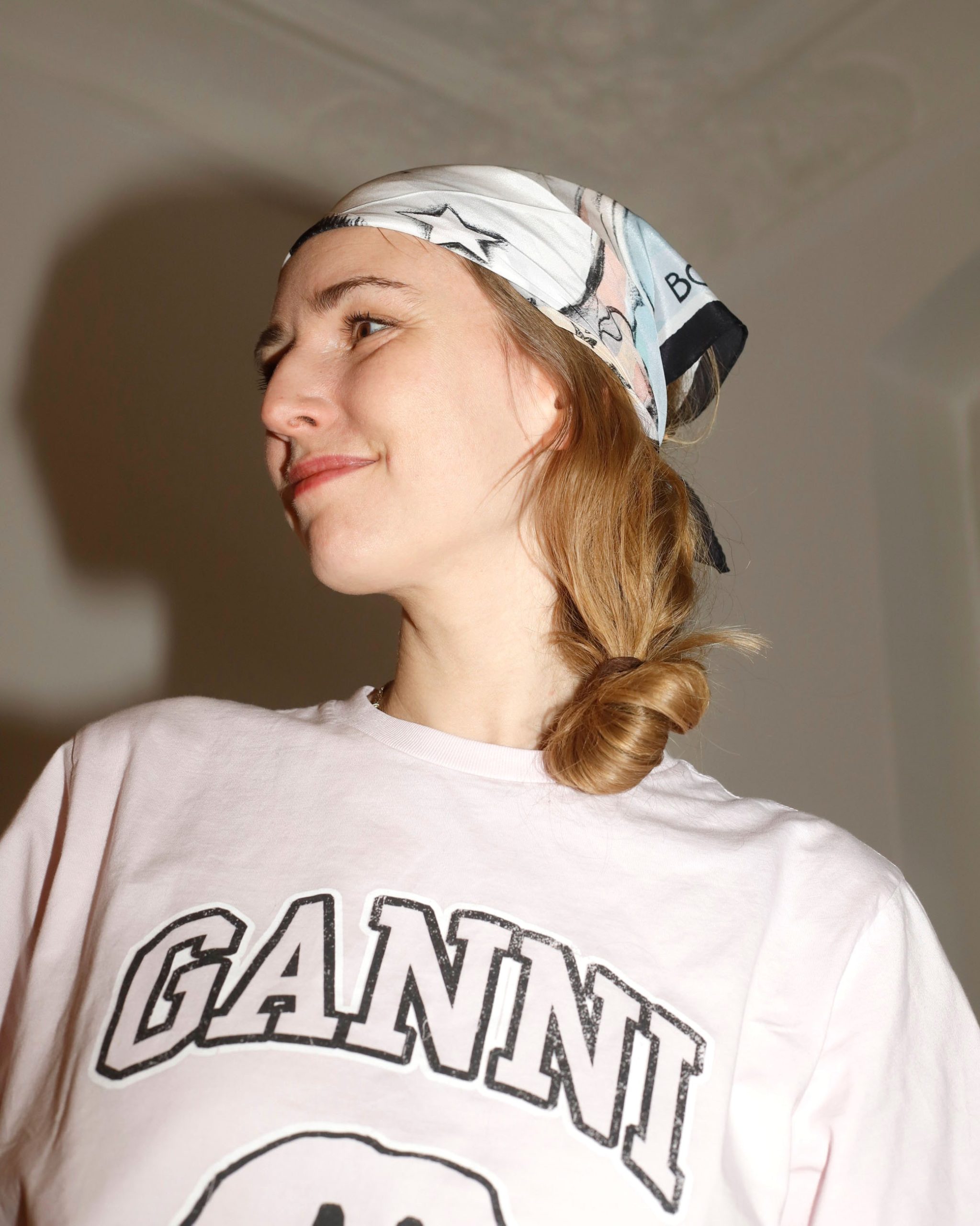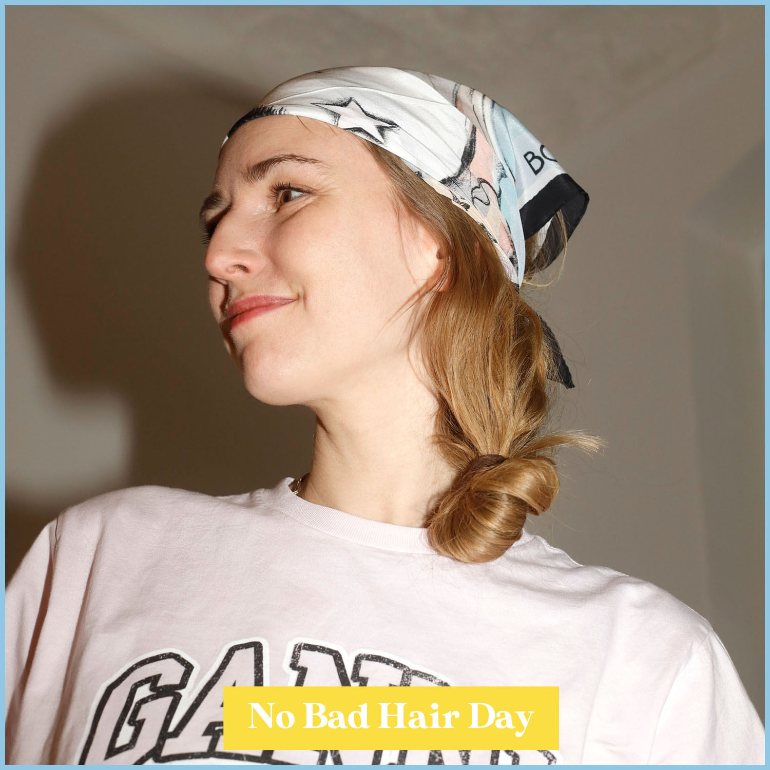 Ja, was soll ich sagen. Manchmal, da hilft einfach gar nichts mehr. Ich fühlte mich mit einem Seidentuch lange Zeit verkleidet, zurück an meine früheste Teenie-Zeit erinnert und empfand solch ein Tuch als lästig, weil es permanent verrutschte. Mittlerweile habe ich aber nicht nur den Dreh raus, ich habe mich offensichtlich auch an meine 33er-Version mit Seidentuch im Haar gewöhnt. Kaschiert nicht nur hervorragend, sieht auch gleich angezogen und hergerichtet aus.