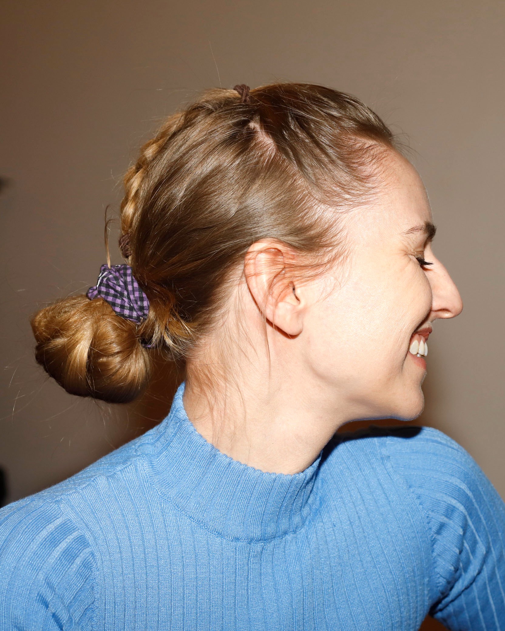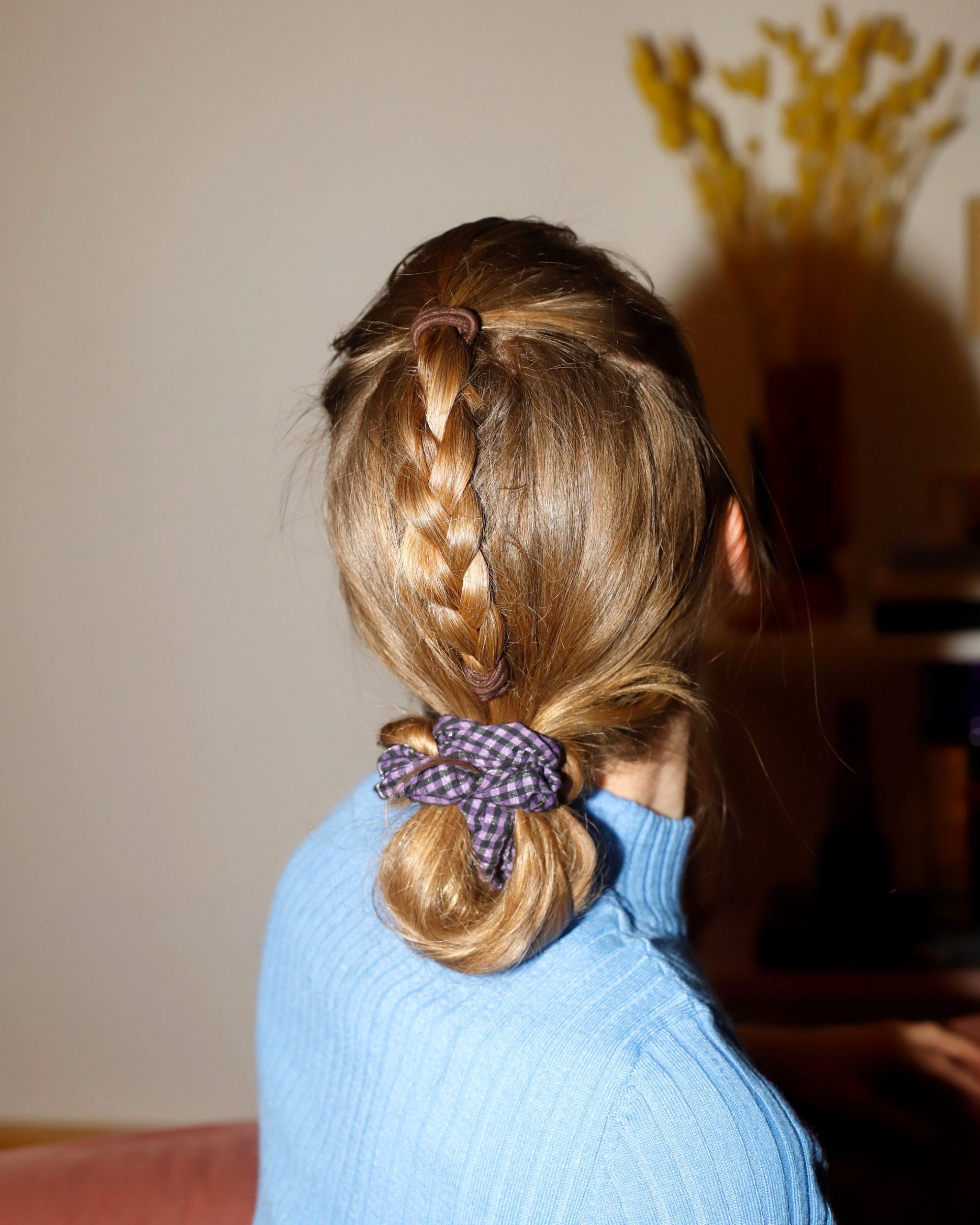 Als Ponyträgerin sind natürlich immer zuerst meine Stripsel auf der Stirn von dem klatschigen Look betroffen, also heißt es: Nach hinten damit und zu einem Half Bun zusammenknoten. Das Zöpfchen anschließend flechten und die gesamten Haare mit einem Scrunchie zu einem tiefen, eingeschlagenen Zopf zusammennehmen.