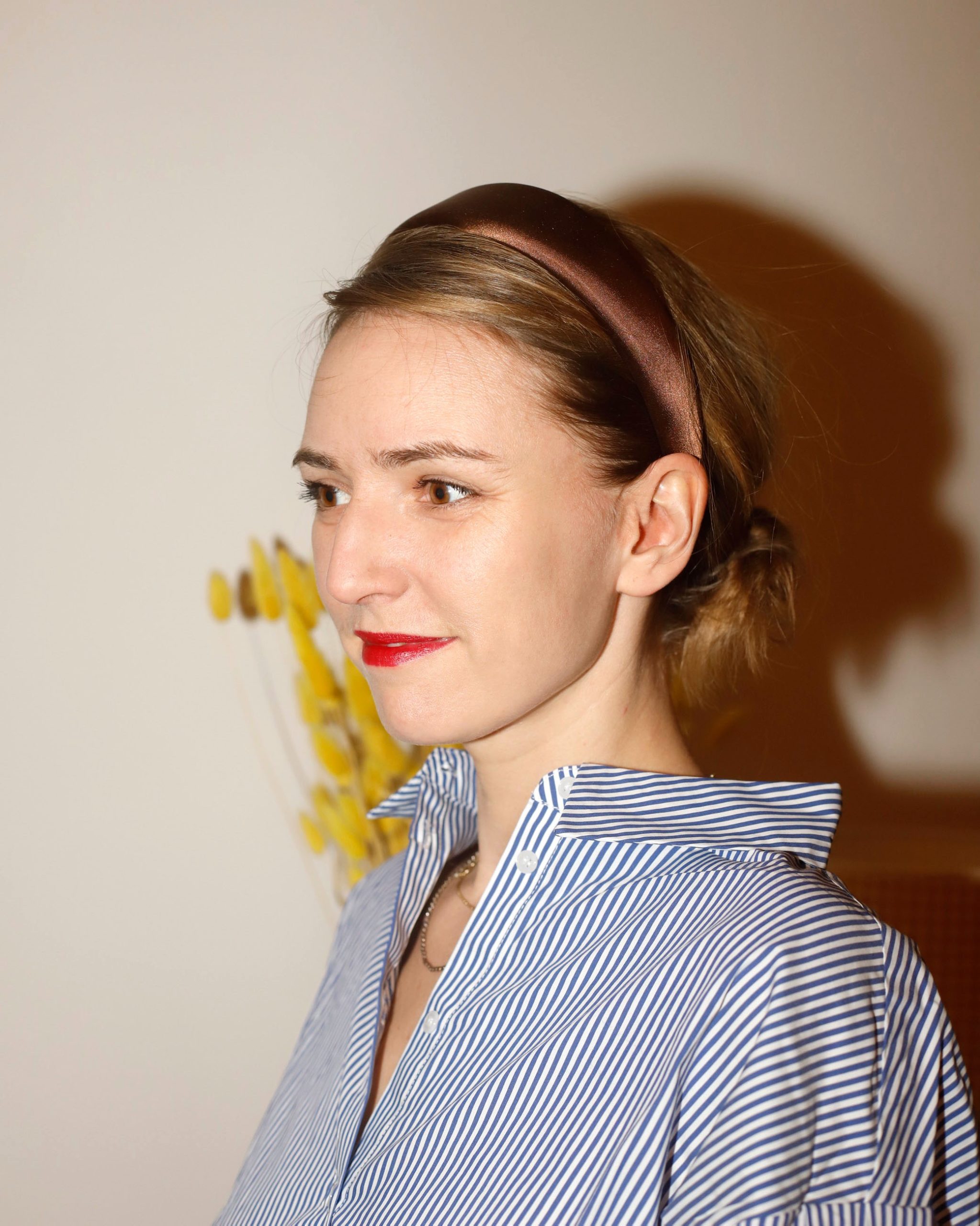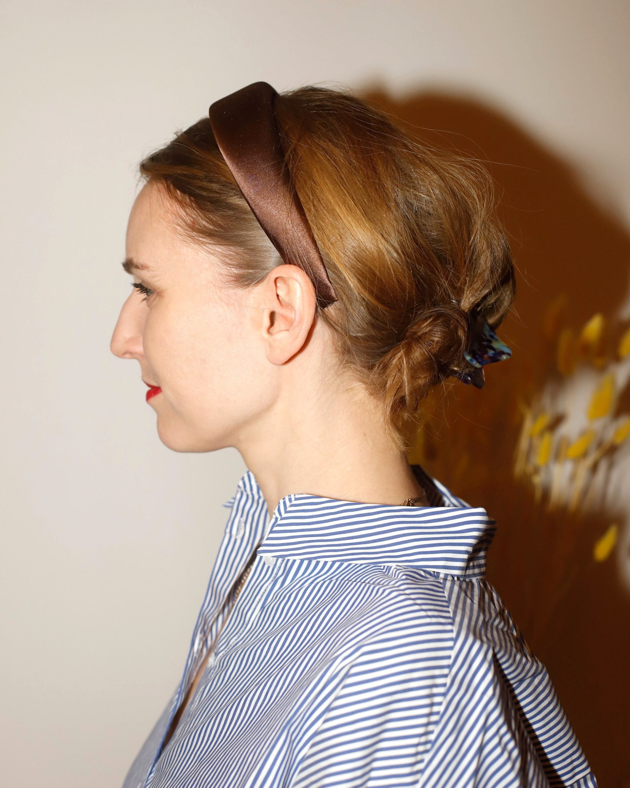 Auch hier gilt wieder, wenn nötig: Die Pony-Partie wieder mit Trockenshampoo oder Volumenpuder einsprühen und ordentlich ausbürsten. Haarreif nicht zu weit hinten ansetzen, sondern eher in der vorderen Partie, um fettigere Strähnen zu kaschieren.