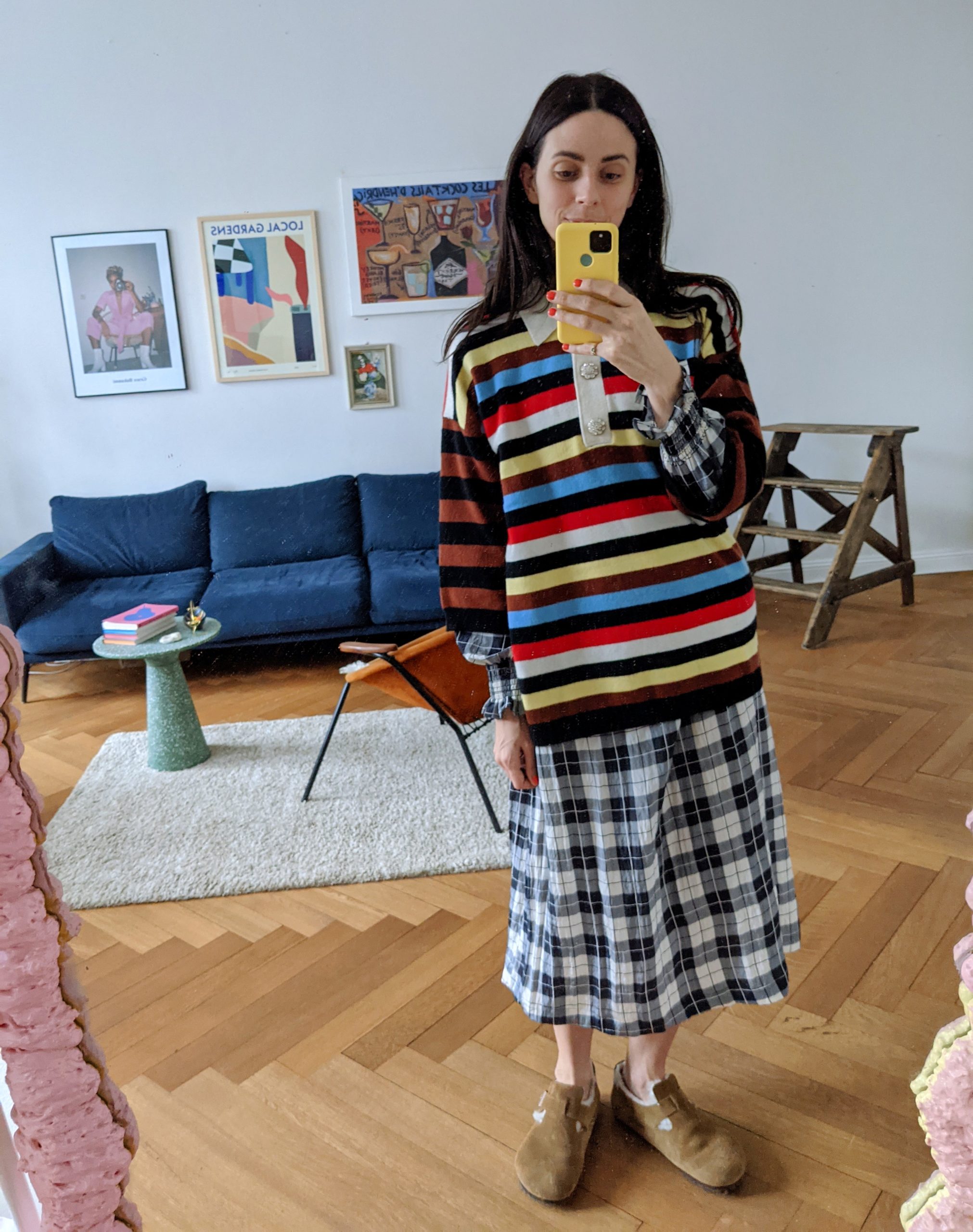 Kleid: Baum und Pferdgarten, Shirt: Ganni, Schuhe: Birkenstock
