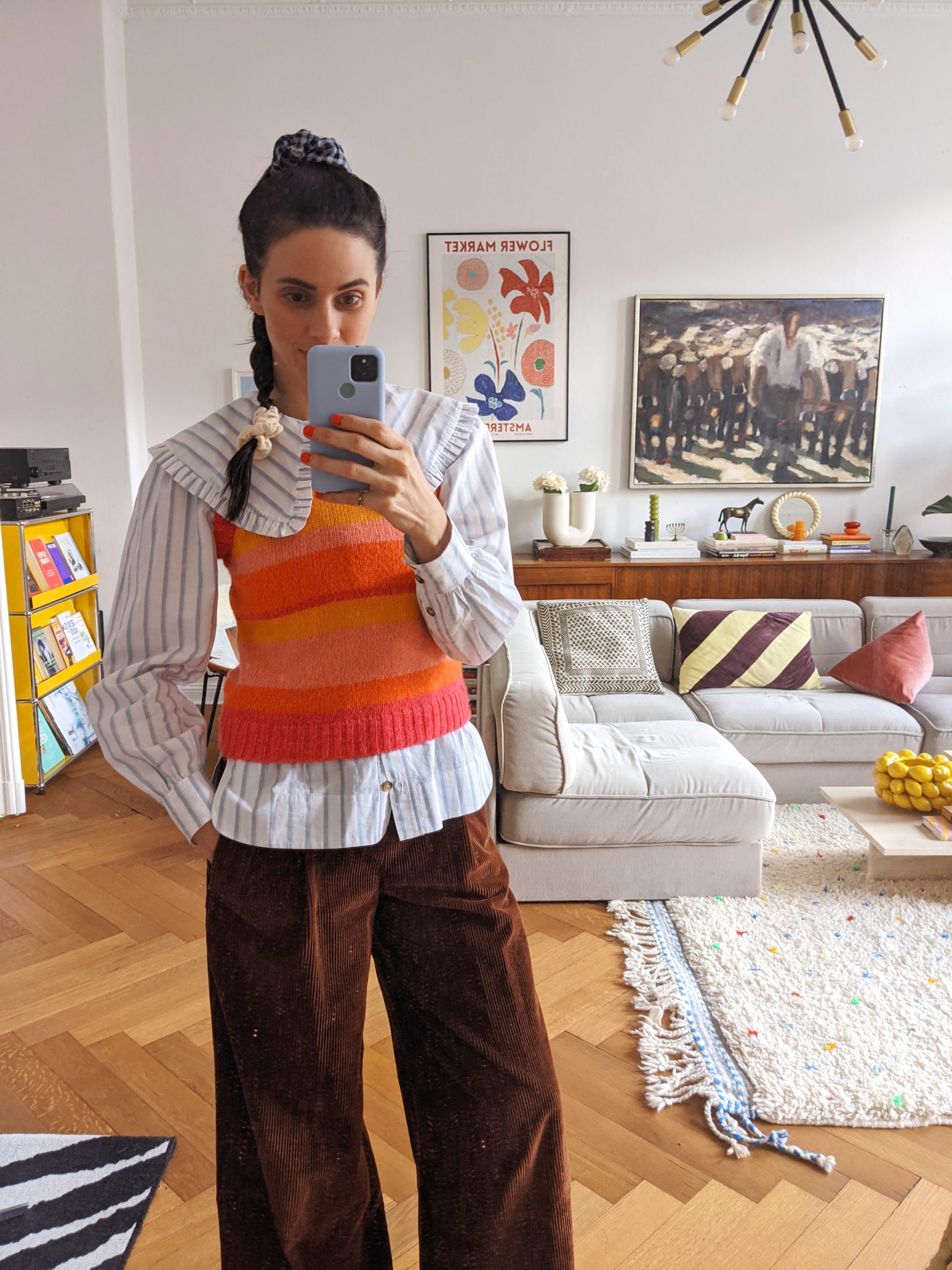 Bluse: Ganni, Pullunder: Baum und Pferdgarten, Hose: Marni