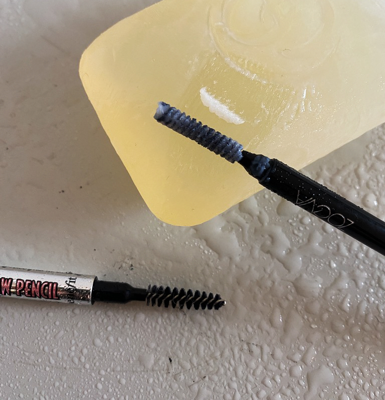 Was ihr nämlich an Werkzeugen für eure perfekt aufgestellten Augenbrauen braucht, ist ein transparentes Stück Seife, das frei von Zusätzen ist, und ein Augenbrauenbürstchen. Wie groß oder klein, das ist euch überlassen. Ich mag die ganz kleinen, spiralförmig gebundenen Bürstchen am liebsten. Schaut mal nach: Meistens findet ihr genau die auf der anderen Seite eurer Augenbrauenstifte.