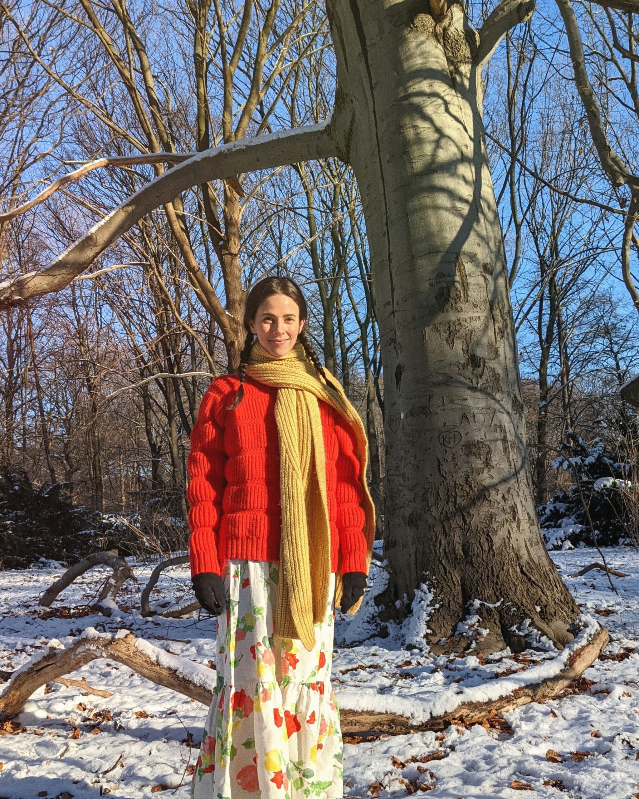 Schal: Acne Studios, Cardigan: Henrik Vibskov, Kleid: Sézane