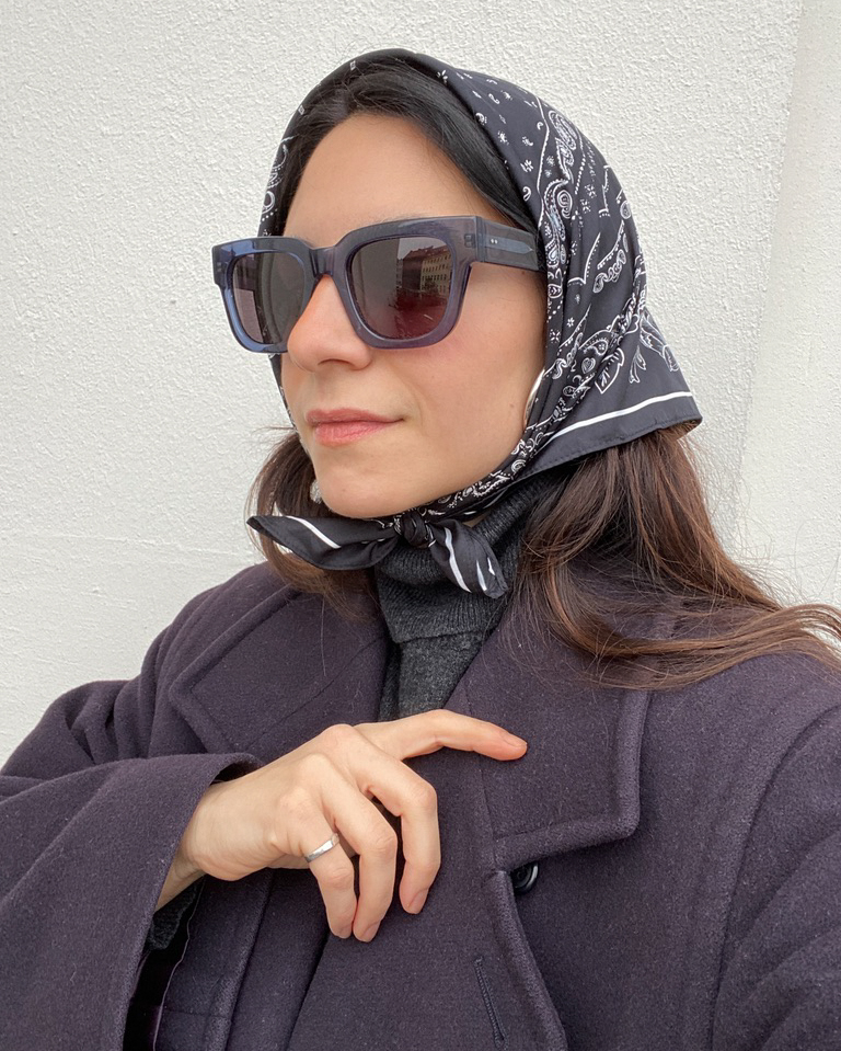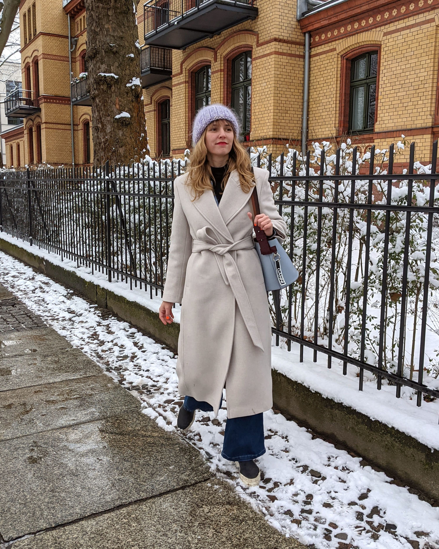 Mantel: Vintage, Pullover: Benetton, Tuch: Secondhand ähnlich hier, Brille: Ace&Tate ähnlich hier
