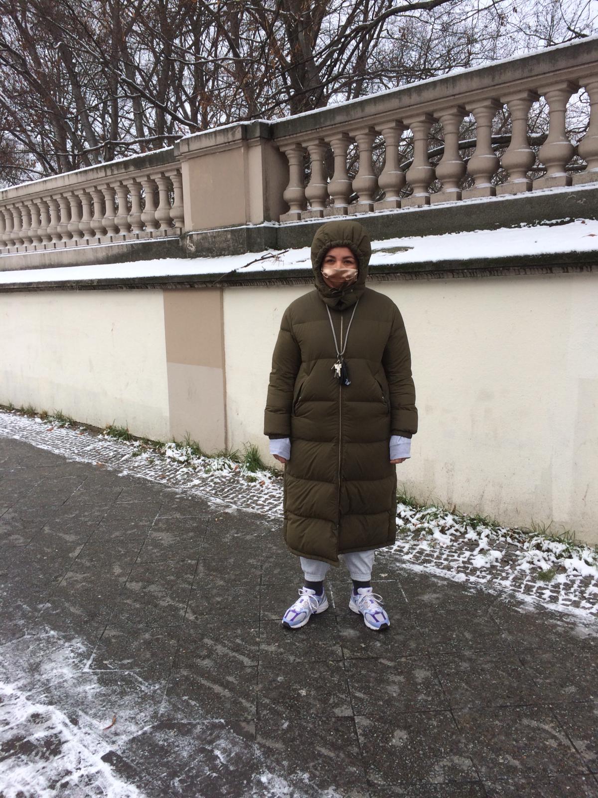 Mantel: Arket, Maske: Etsy, Schuhe: New Balance, Jogger: H&M (alt)